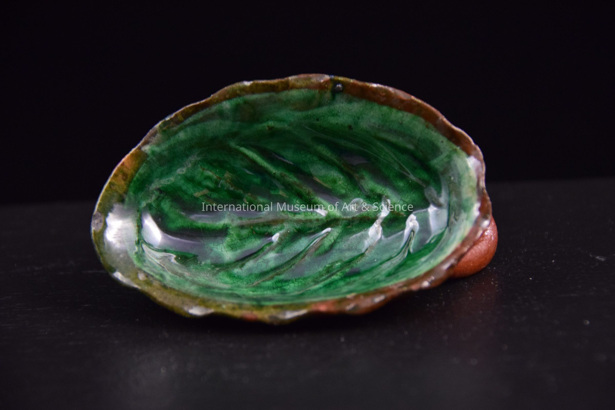 A ceramic leaf. The leaf is shaped like a scoop and has a handle on the back. It is part of a large ceramic pottery tower sculpture. The leaves hang off one of the main sections.Dimensions