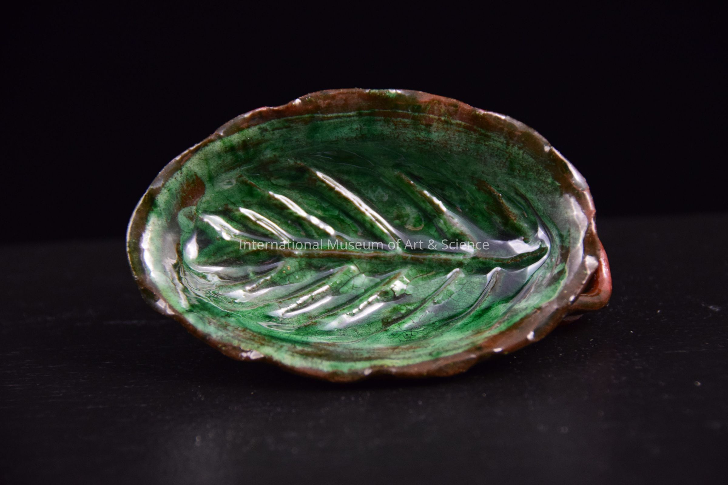 A ceramic leaf. The leaf is shaped like a scoop and has a handle on the back. It is part of a large ceramic pottery tower sculpture. The leaves hang off one of the main sections.Dimensions