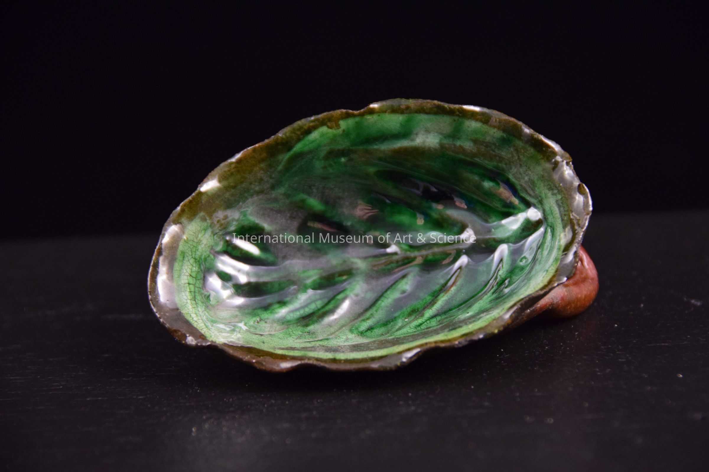 A ceramic leaf. The leaf is shaped like a scoop and has a handle on the back. It is part of a large ceramic pottery tower sculpture. The leaves hang off one of the main sections.Dimensions