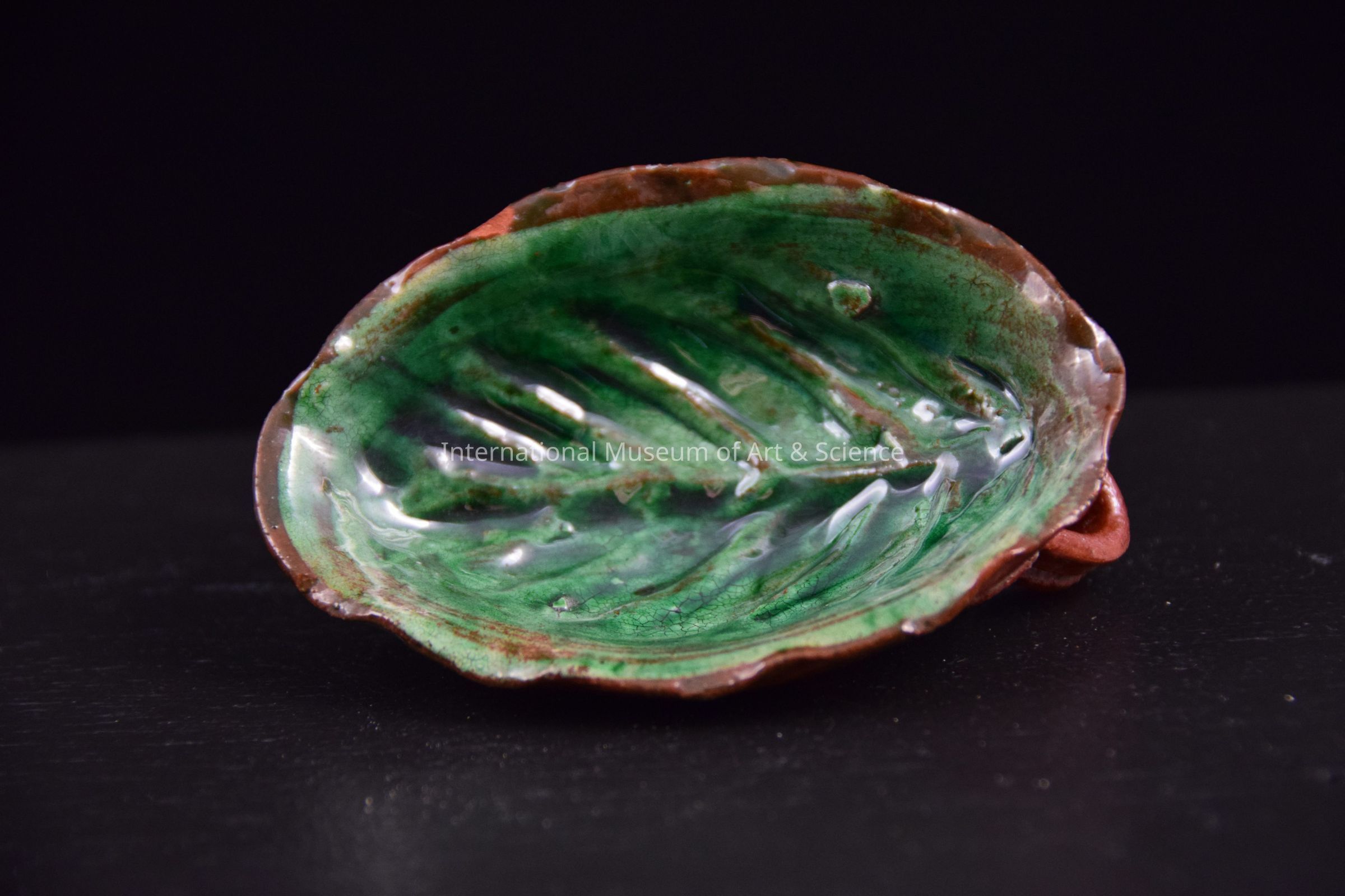 A ceramic leaf. The leaf is shaped like a scoop and has a handle on the back. It is part of a large ceramic pottery tower sculpture. The leaves hang off one of the main sections.Dimensions