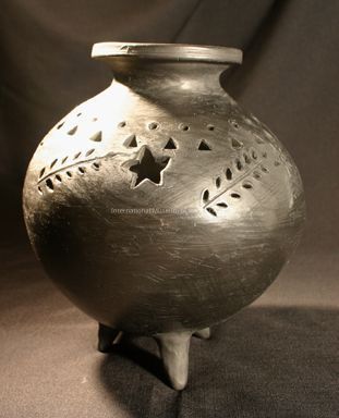A large tripod vesse. The body is decorated with incised designs of holes, triangles, flowers, leaves and star. It is created from barro negro/black pottery.Ethnography