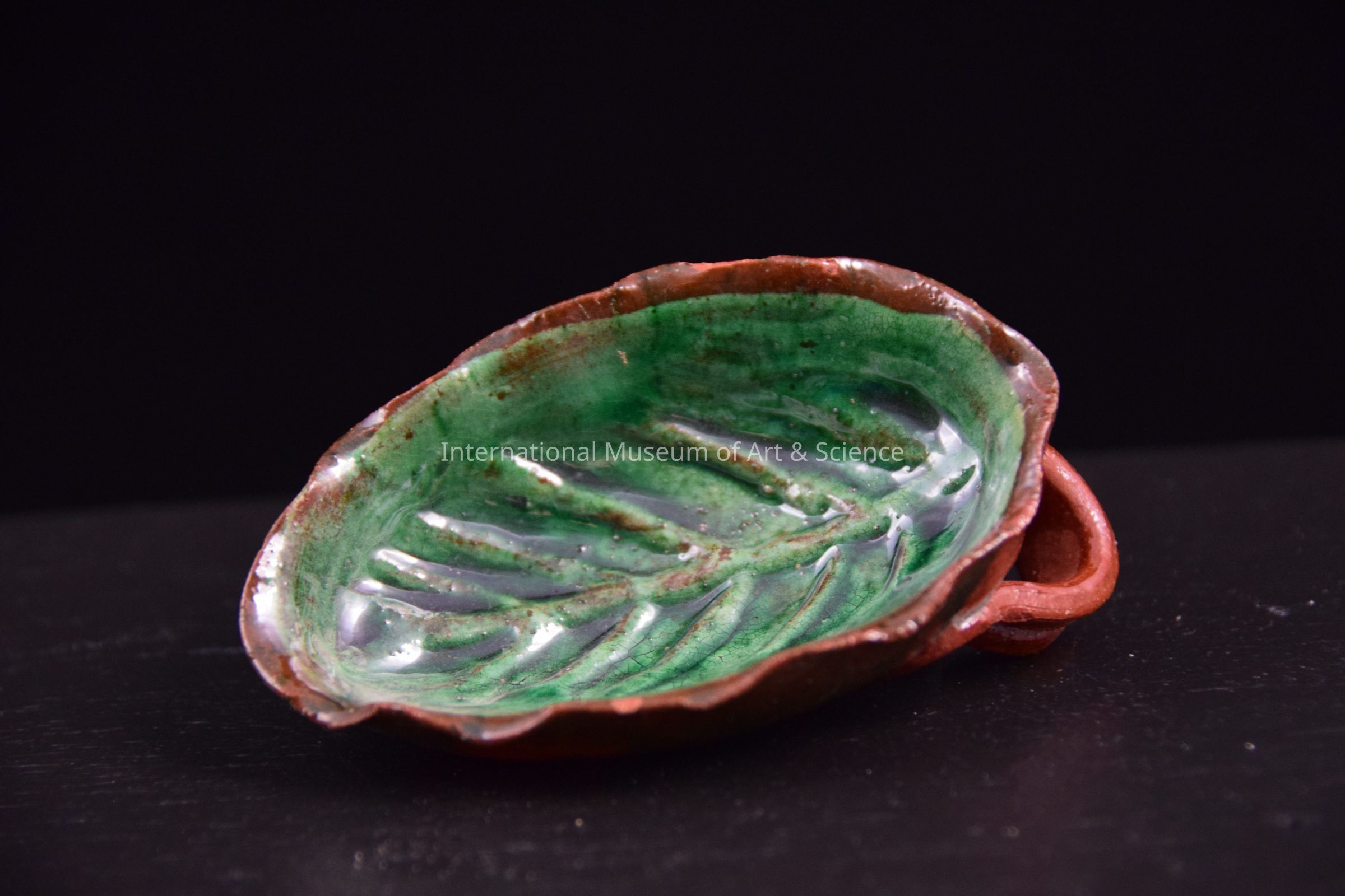 A ceramic leaf. The leaf is shaped like a scoop and has a handle on the back. It is part of a large ceramic pottery tower sculpture. The leaves hang off one of the main sections.Dimensions