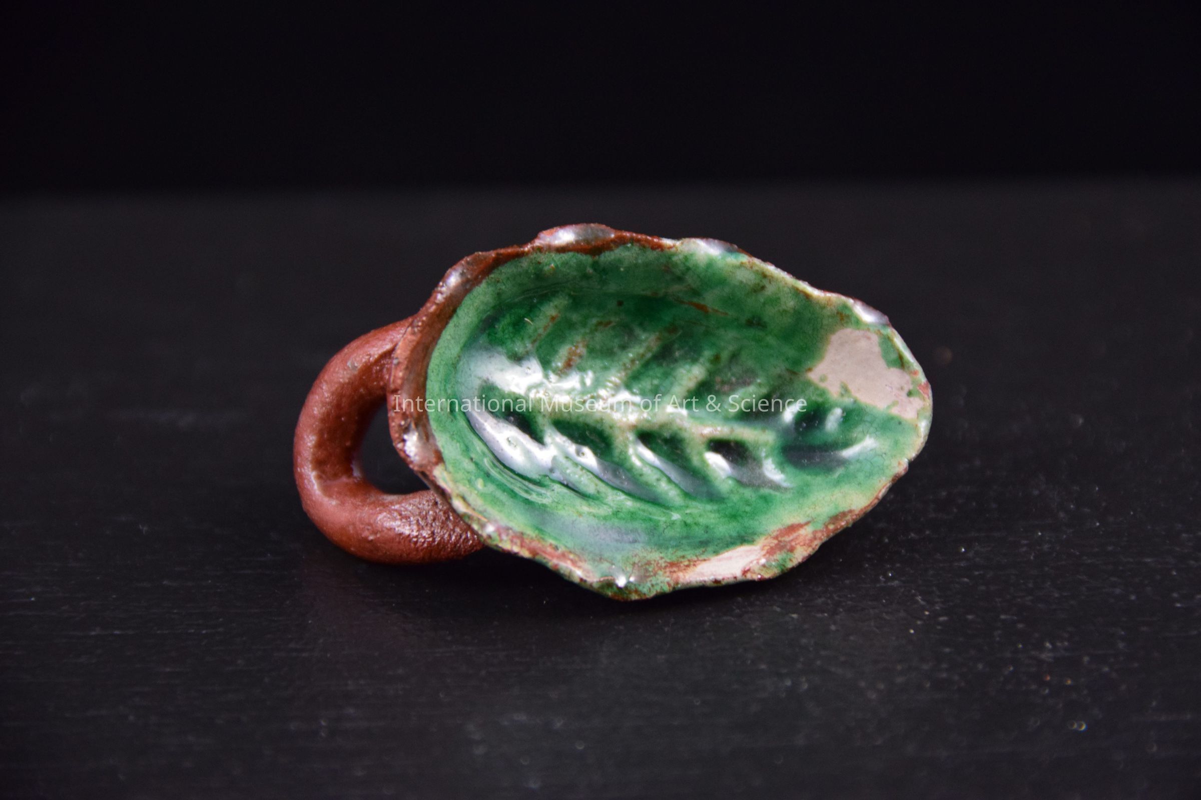 A ceramic leaf. The leaf is shaped like a scoop and has a handle on the back. It is part of a large ceramic pottery tower sculpture. The leaves hang off one of the main sections.Dimensions
