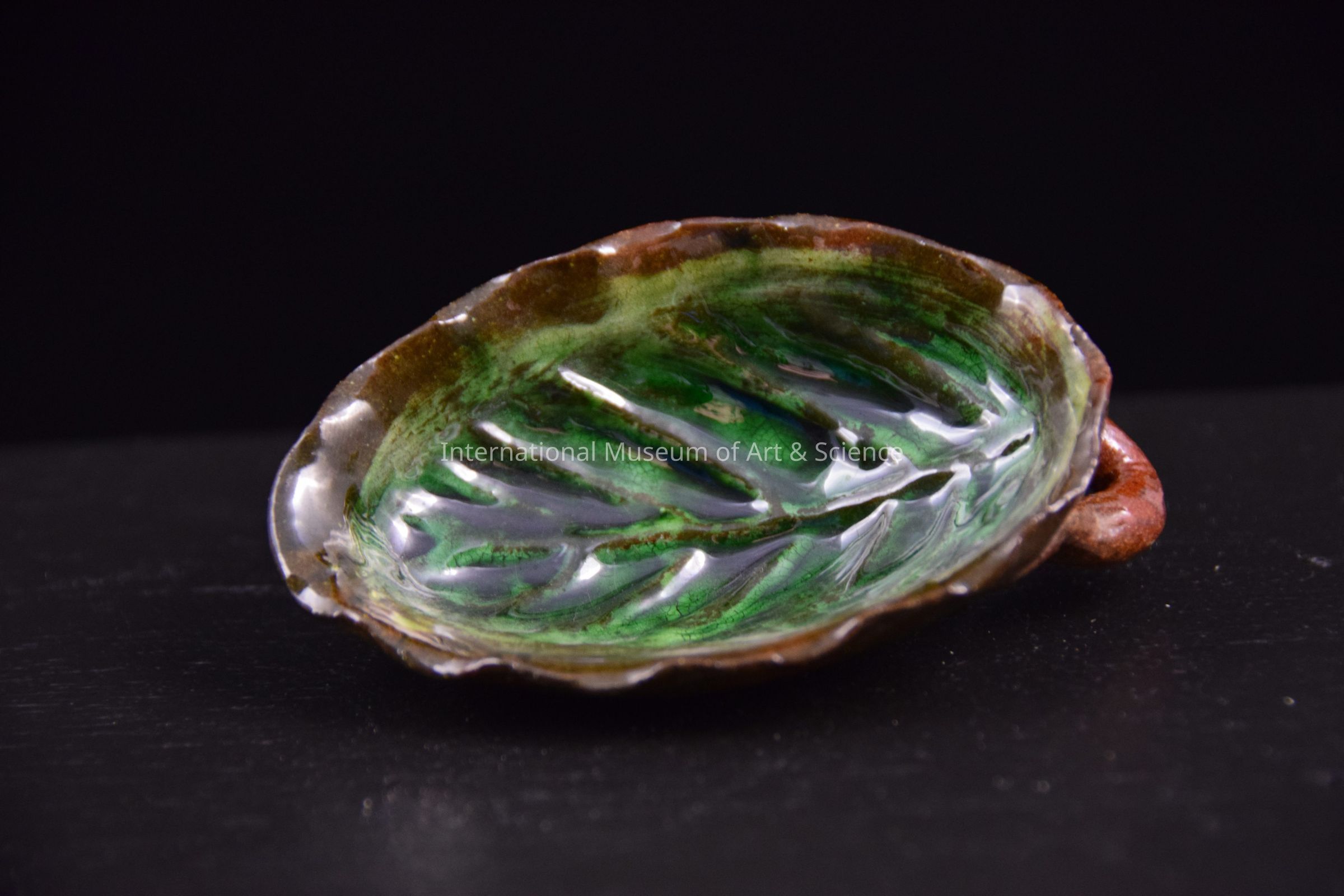 A ceramic leaf. The leaf is shaped like a scoop and has a handle on the back. It is part of a large ceramic pottery tower sculpture. The leaves hang off one of the main sections.Dimensions