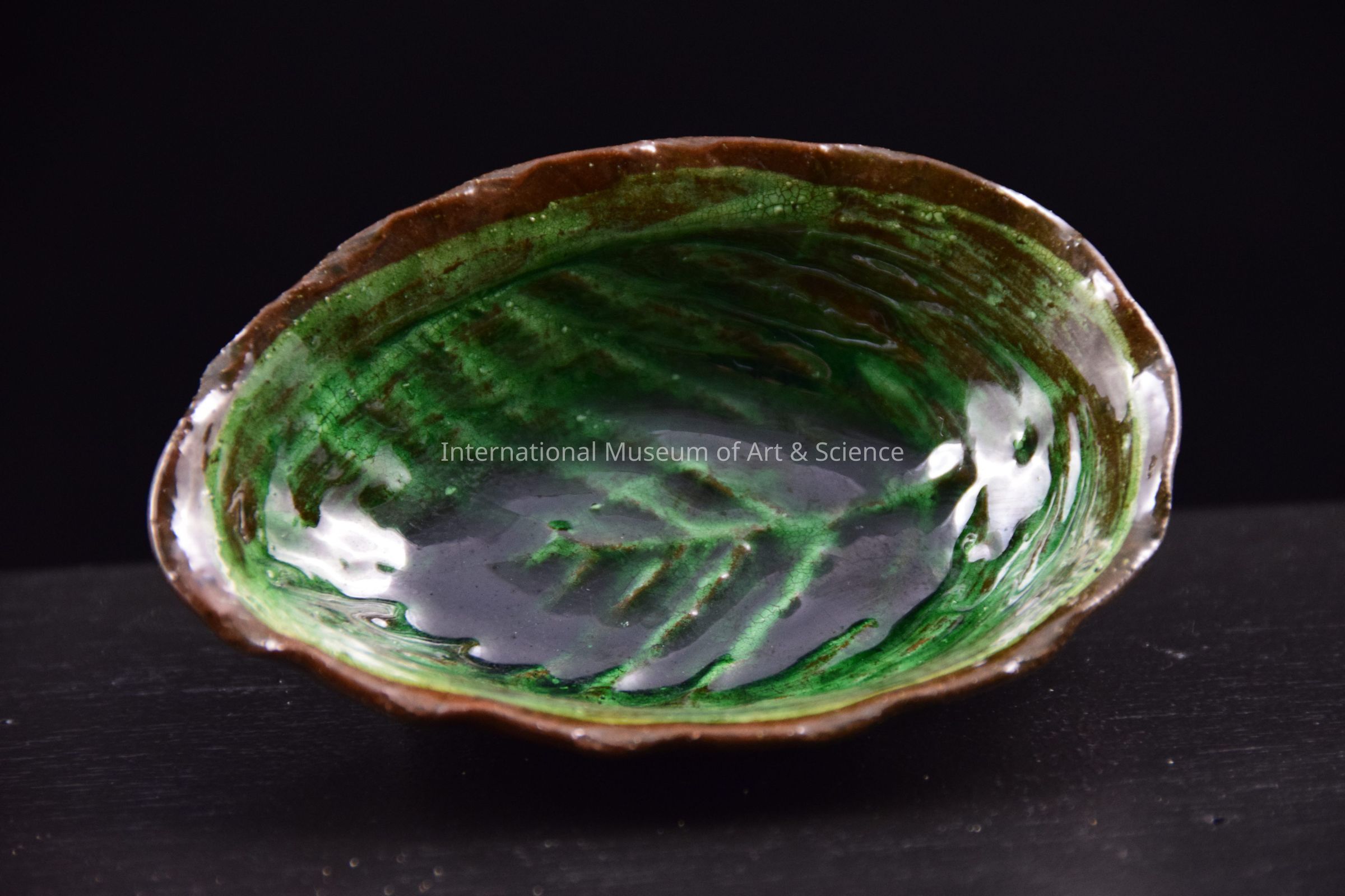 A ceramic leaf. The leaf is shaped like a scoop and has a handle on the back. It is part of a large ceramic pottery tower sculpture. The leaves hang off one of the main sections.Dimensions