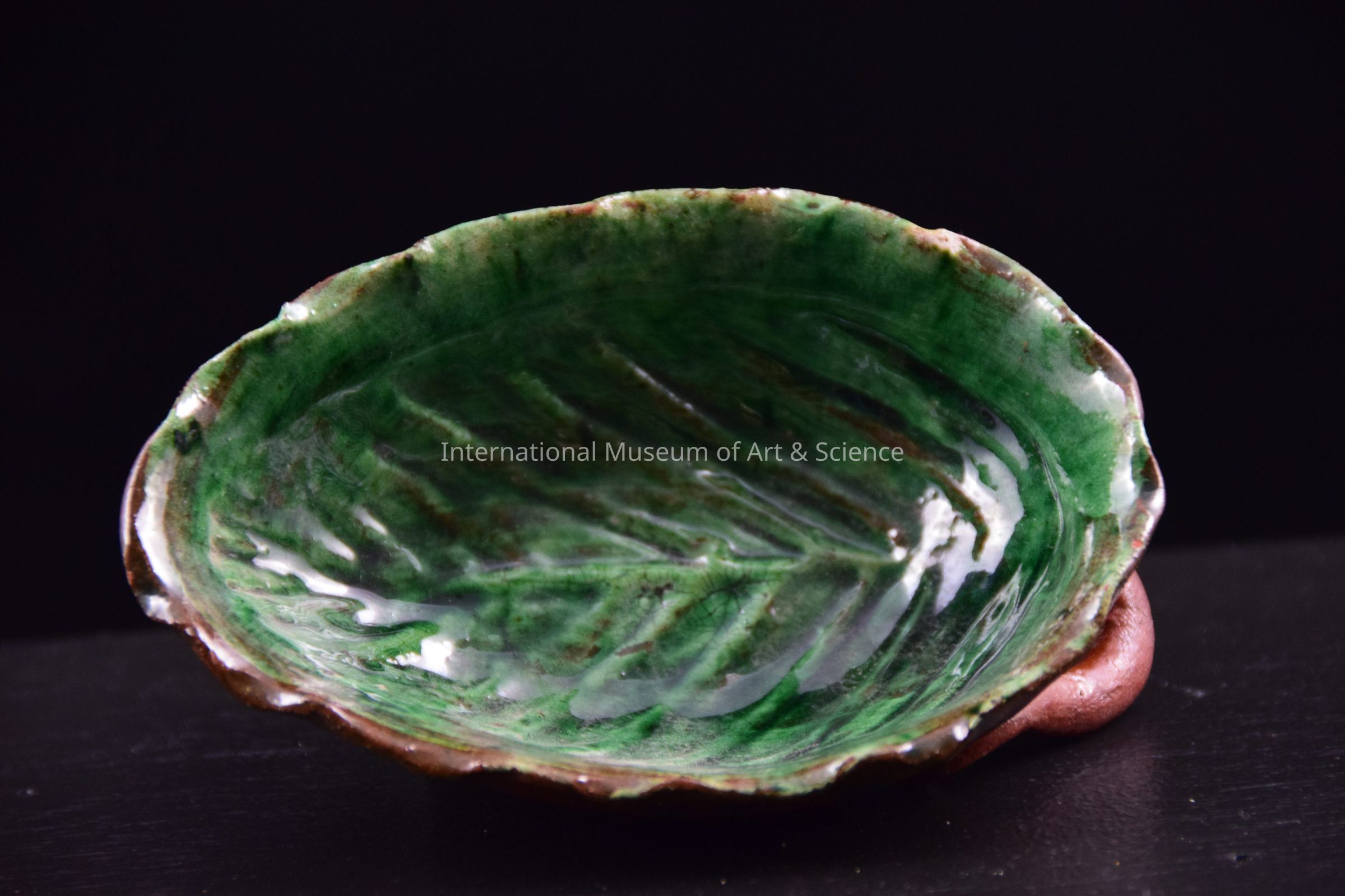 A ceramic leaf. The leaf is shaped like a scoop and has a handle on the back. It is part of a large ceramic pottery tower sculpture. The leaves hang off one of the main sections.Dimensions