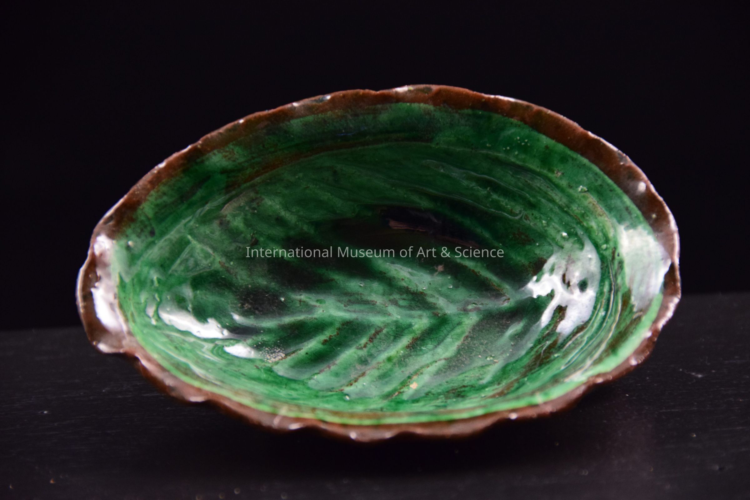 A ceramic leaf. The leaf is shaped like a scoop and has a handle on the back. It is part of a large ceramic pottery tower sculpture. The leaves hang off one of the main sections.Dimensions