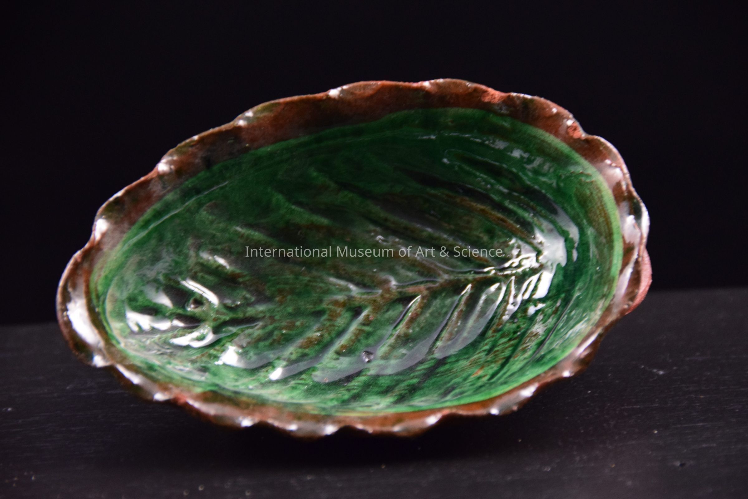 A ceramic leaf. The leaf is shaped like a scoop and has a handle on the back. It is part of a large ceramic pottery tower sculpture. The leaves hang off one of the main sections.Dimensions