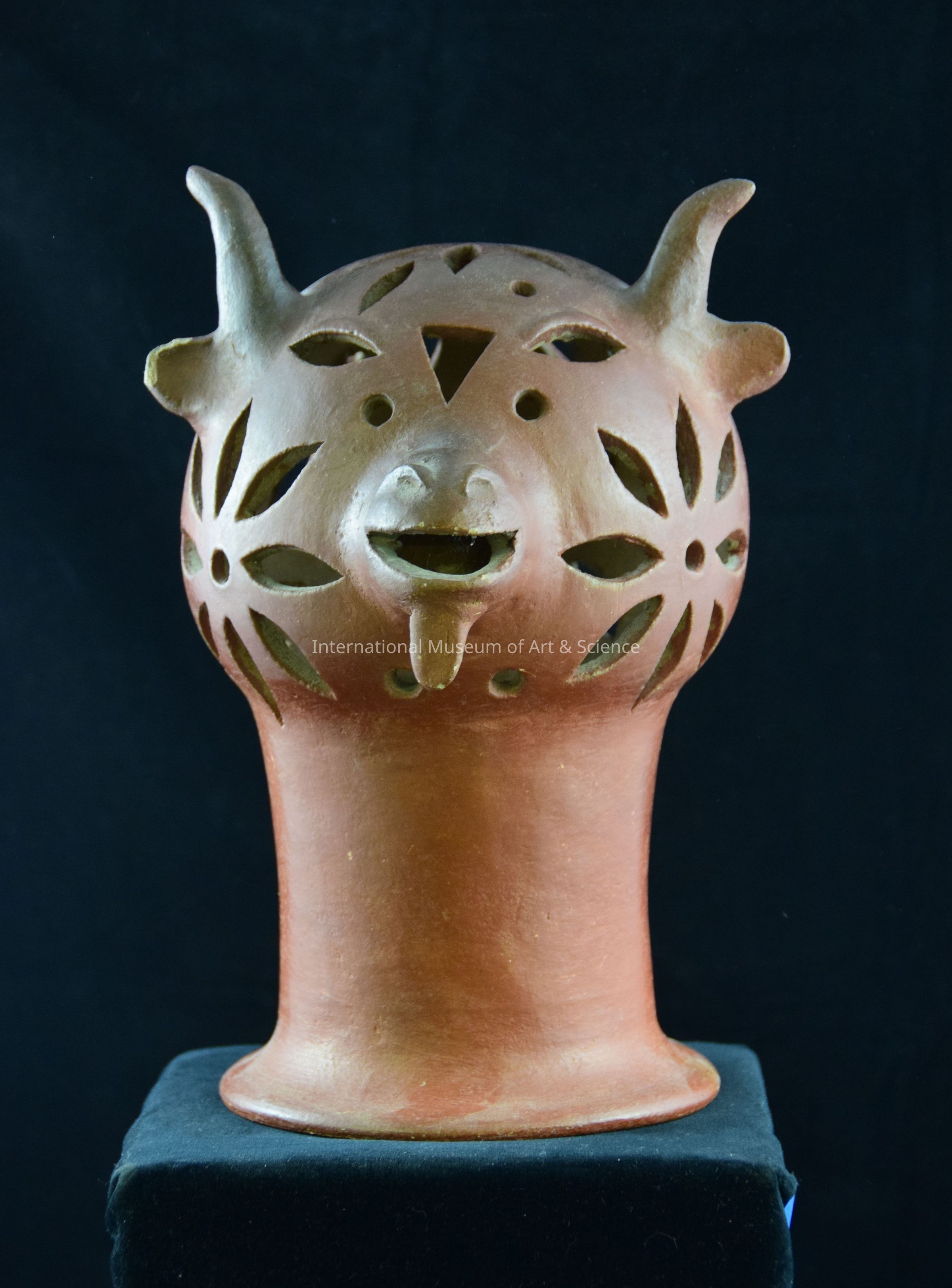 A ceramic lantern. The lantern has a large cylinder neck that opens up into a sphere. The sphere is sculpted to look like a goat head with eyes, a snout, ears and horns. The sphere has geometric and floral designs cut into it, to let the light though. The exterior of the piece is burnish smooth.Dimensions