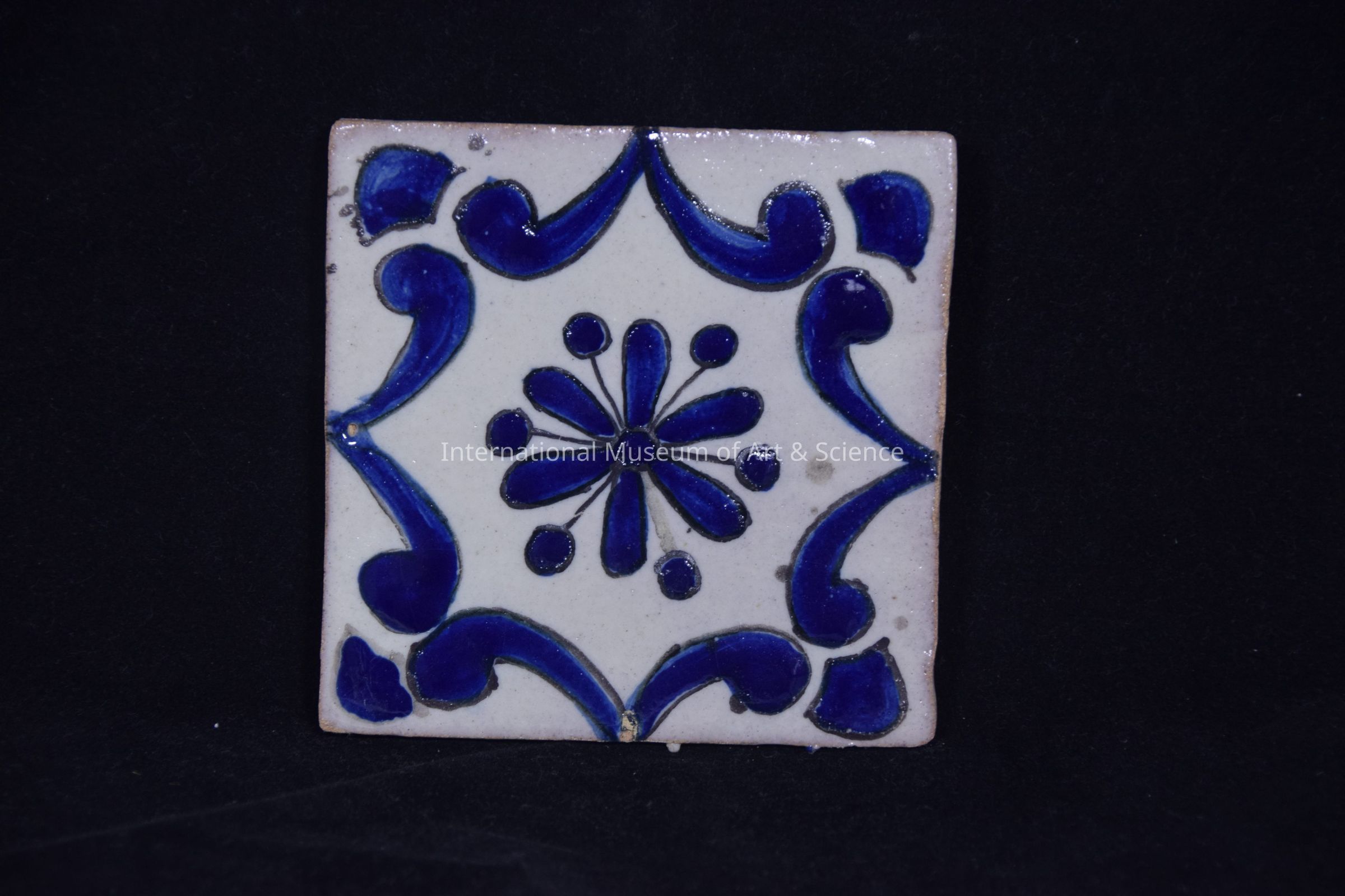 A terracotta tile with a glazed top. The top is designed with a flower in the center surrounded by a intricate border. Colors used are blue, black, and white. Sides and back are unglazed.Made/Created