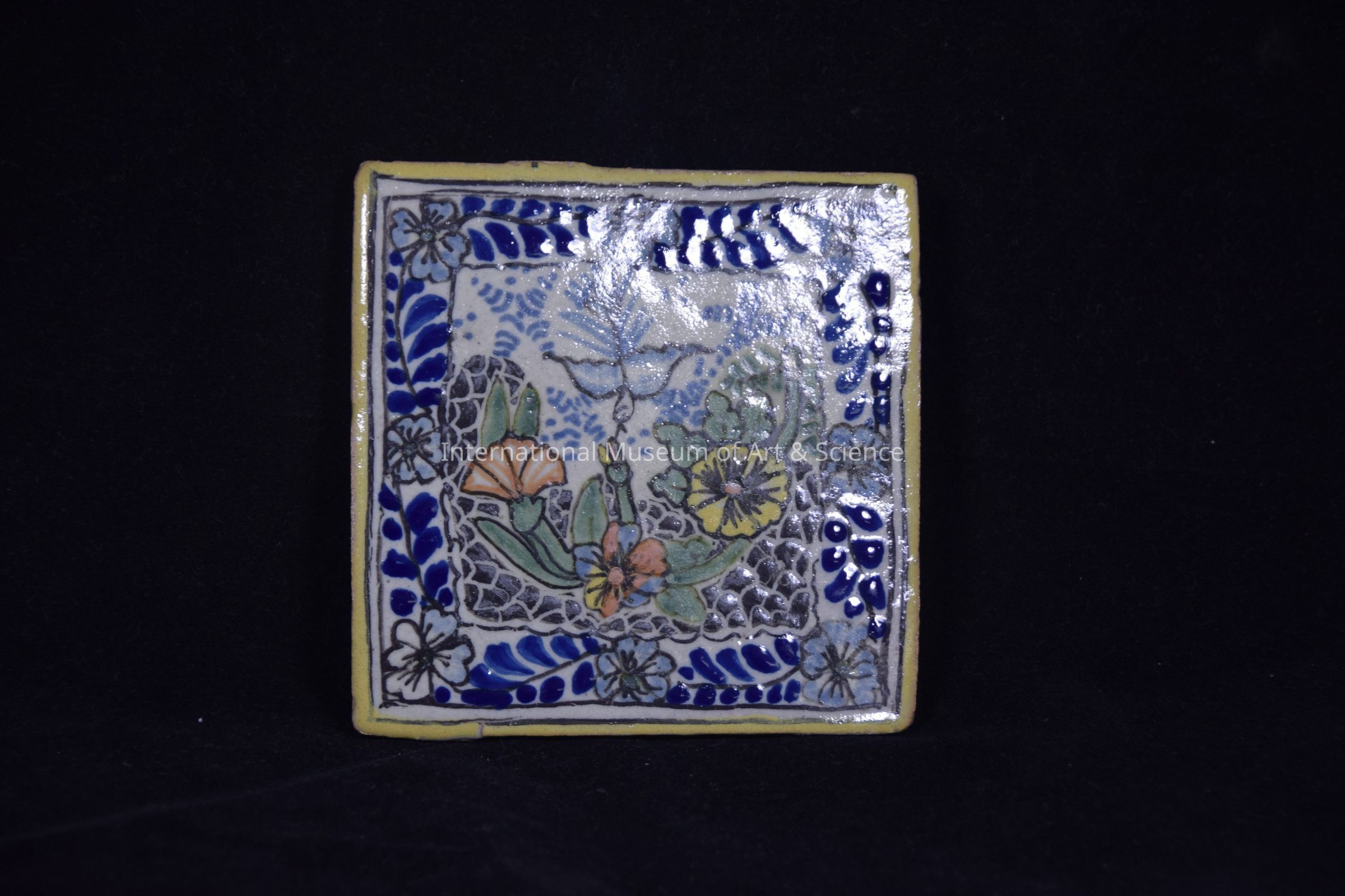 A terracotta tile with glazed top. The tile is intricately glazed with a floral design with large flowers in the center and a bird in flight. Colors include white, light blue, blue, black, yellow, green, pink, and orange. Sides and back are not glazed.Made/Created
