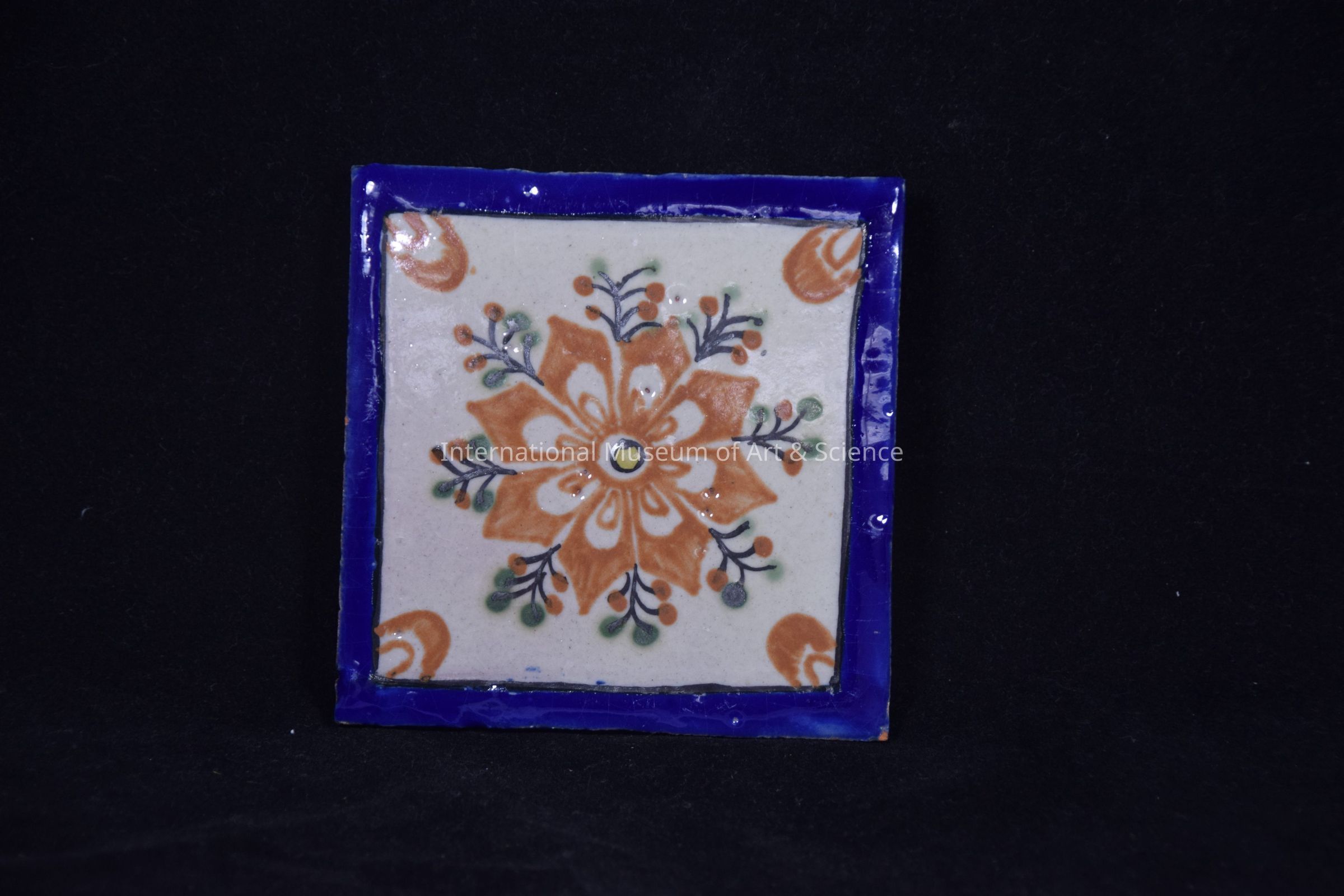 A clay title with a glazed top. There is a orange flower at center, surrounded by green and orange berries, with a blue border. The sides and back are not glazed.Made/Created