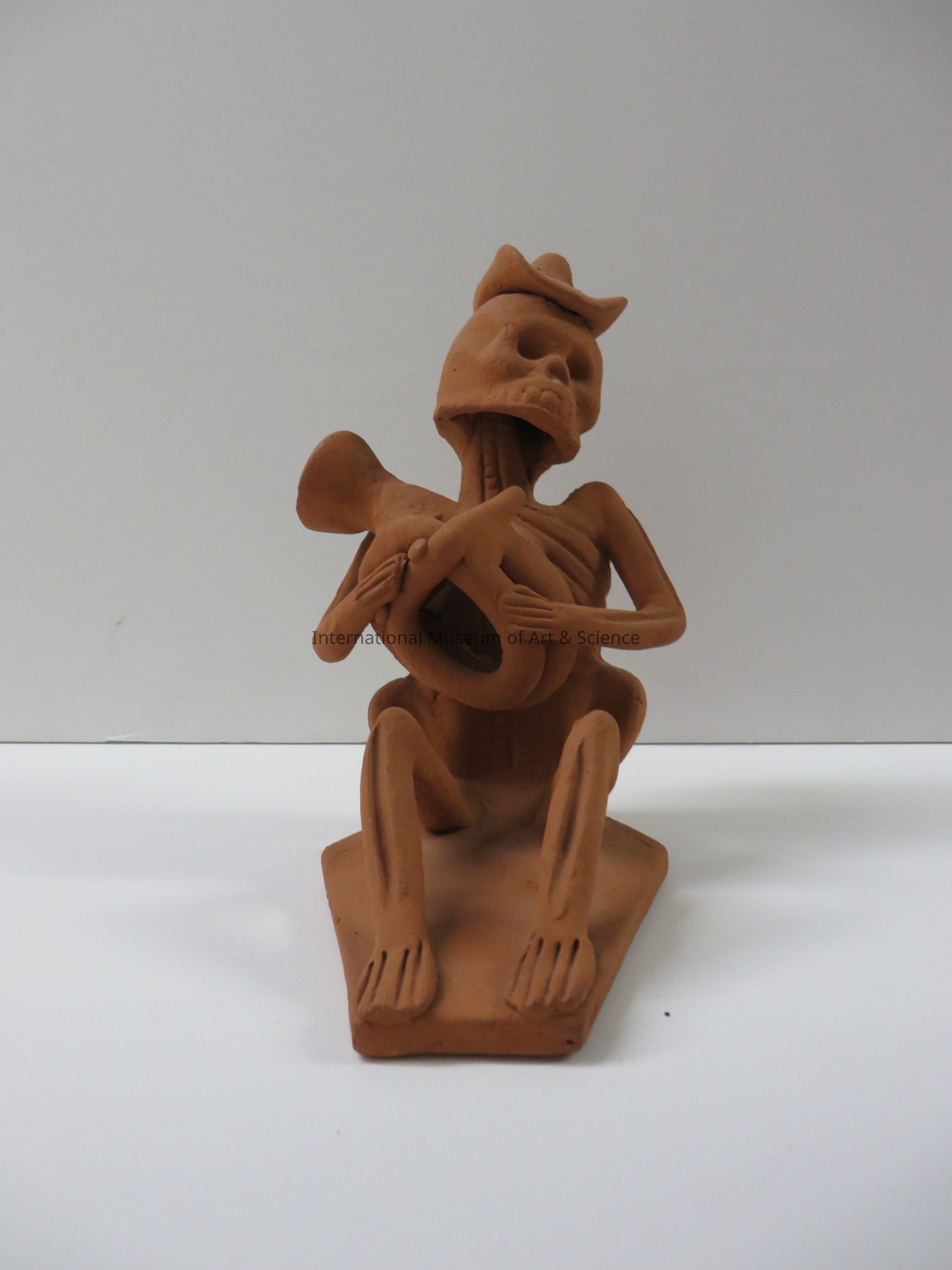 Skeleton holding musical horn. Sitting on a coffin shaped base; wears small hat.Dimensions