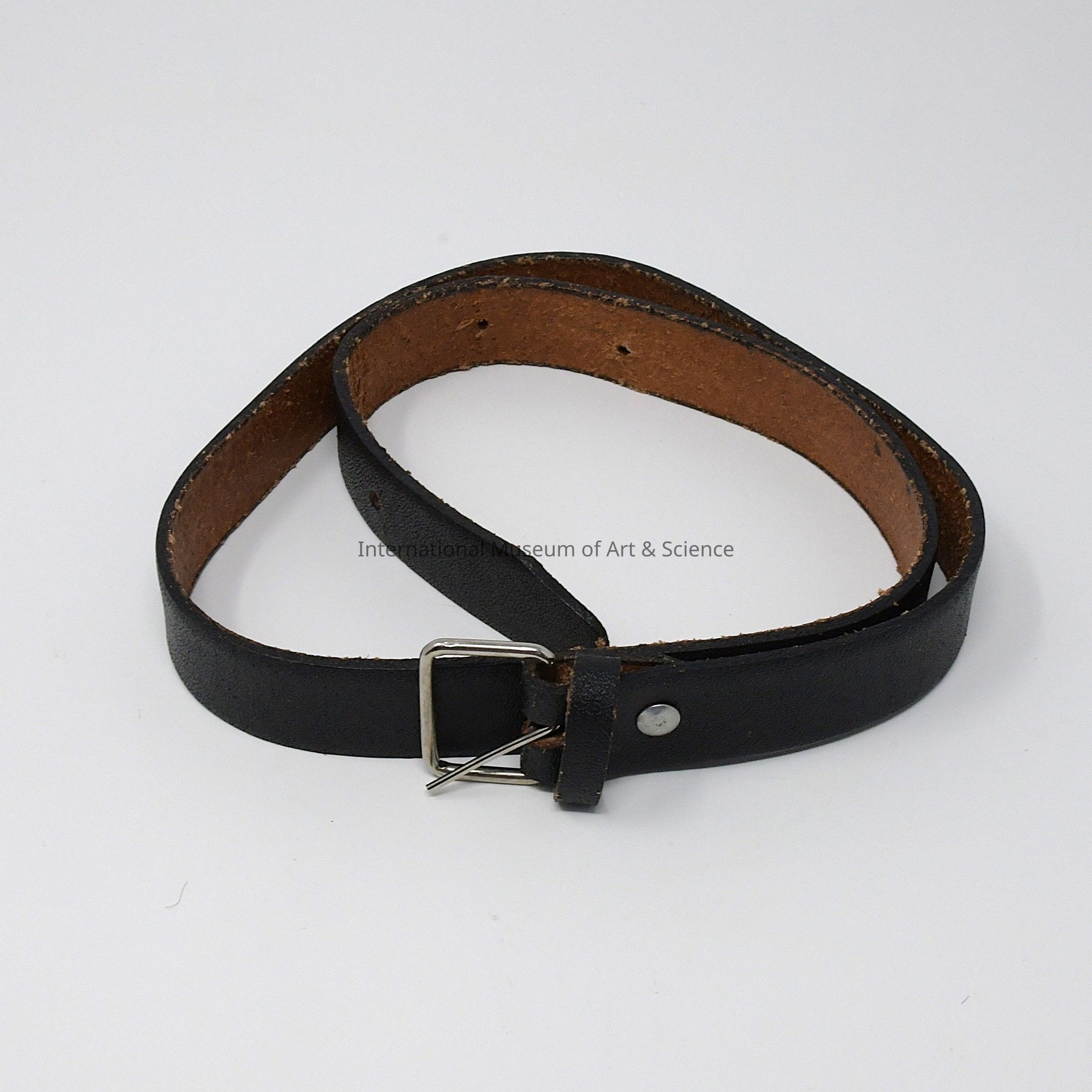 A narrow, hand-crafted leather belt dyed black on the exterior surface, with the natural brown of the leather visible on the interior. The belt is cut from a single strip of leather with straight edges and a smooth, matte finish. One end is fitted with a small, rectangular metal buckle in silver-tone finish, secured by a loop of leather and a single metal rivet. The opposite end is punctured with multiple adjustment holes. The belt shows signs of gentle wear, including softened leather and slight creasing, particularly near the buckle and adjustment points.Ethnography