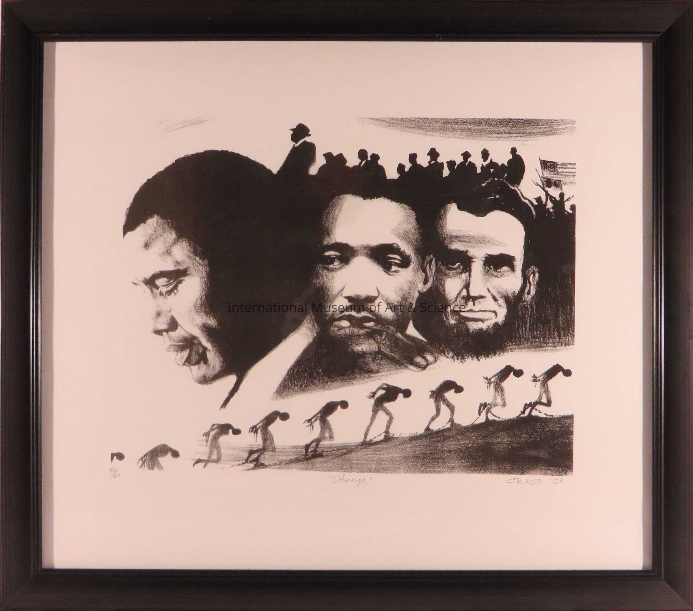 The print features the image of Barack Obama, Martin Luther King, and Abraham Lincoln. In the print, Criner portrays in silhouette the history of African Americans. This tumultuous history is woven through the design, beginning with slavery, the Civil Rights movement, and finally, the Obama Presidency.