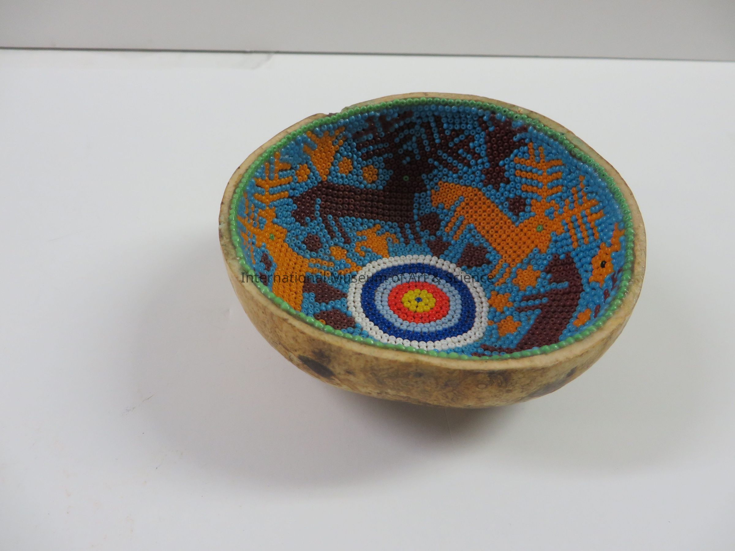 Chaquira (votive bowl). Half a dried gourd lined with tiny multi-colored glass beads; orange and brown reindeers.Artwork Details