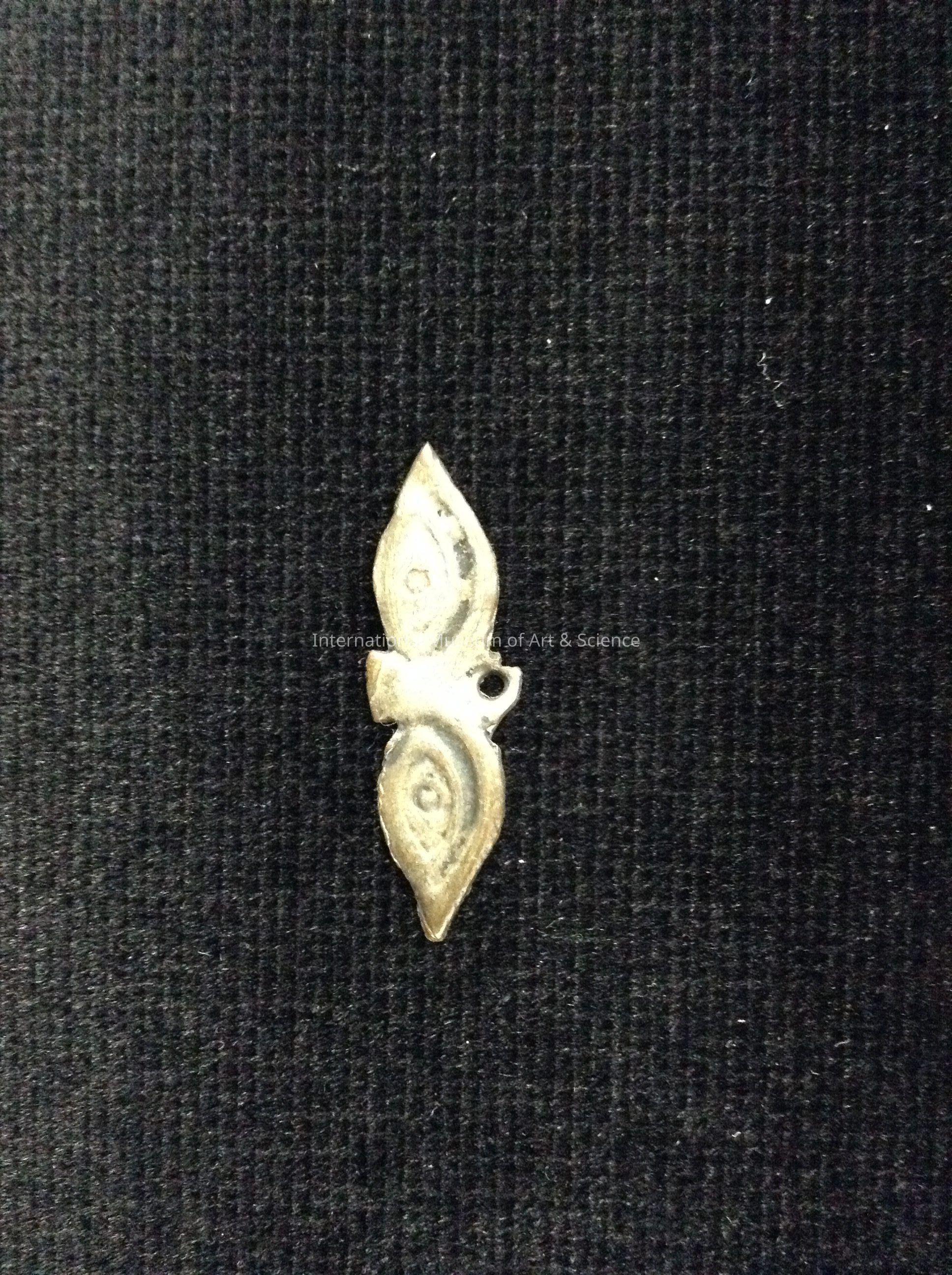 A small silver charm (Milagros). It is in the shape of a set of eyes. There is a ring at the top to attach to a chain.Dimensions