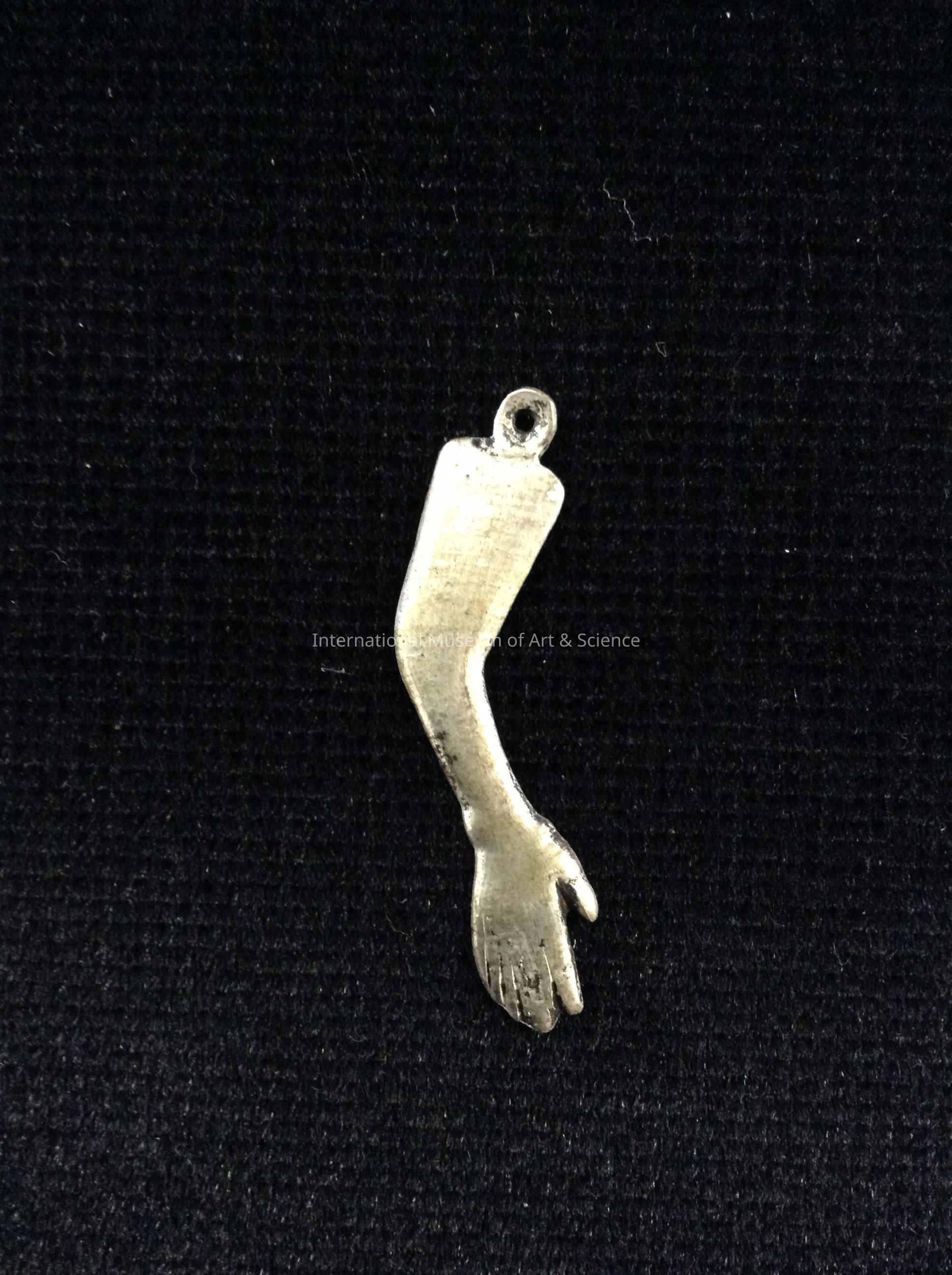 A small silver charm (Milagros). It is in the shape of a right arm. There is a ring at the top to attach to a chain.Dimensions