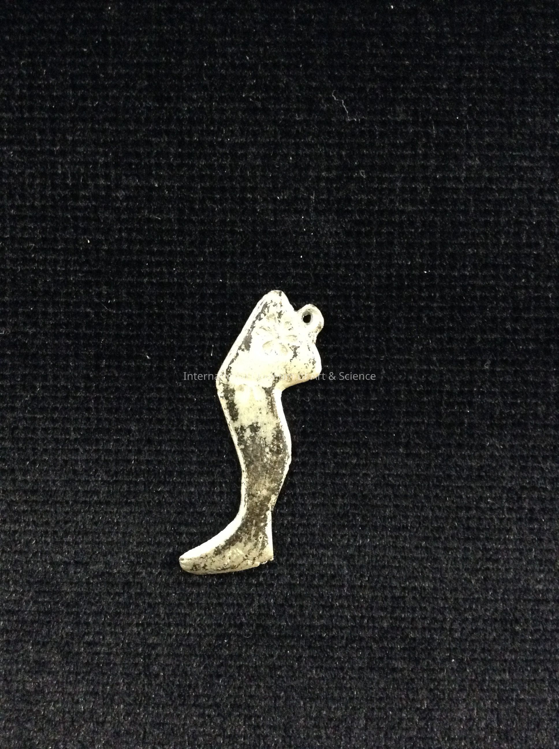 A small silver charm (Milagros). It is in the shape of a leg with floral design. There is a ring at the top to attach to a chain.Dimensions