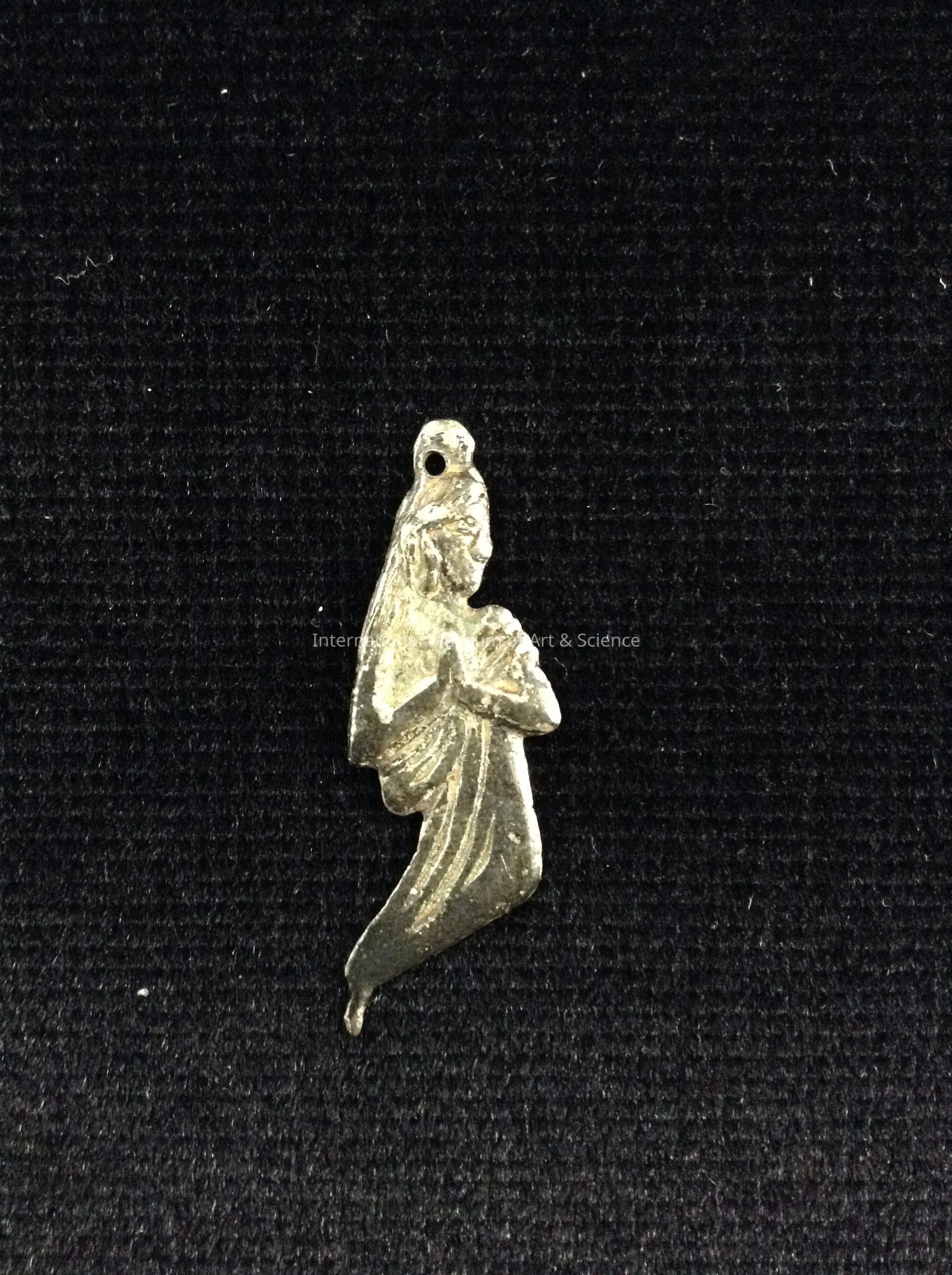 A small silver charm (Milagros). It is in the shape of a kneeling saint. There is a ring at the top to attach to a chain.Dimensions