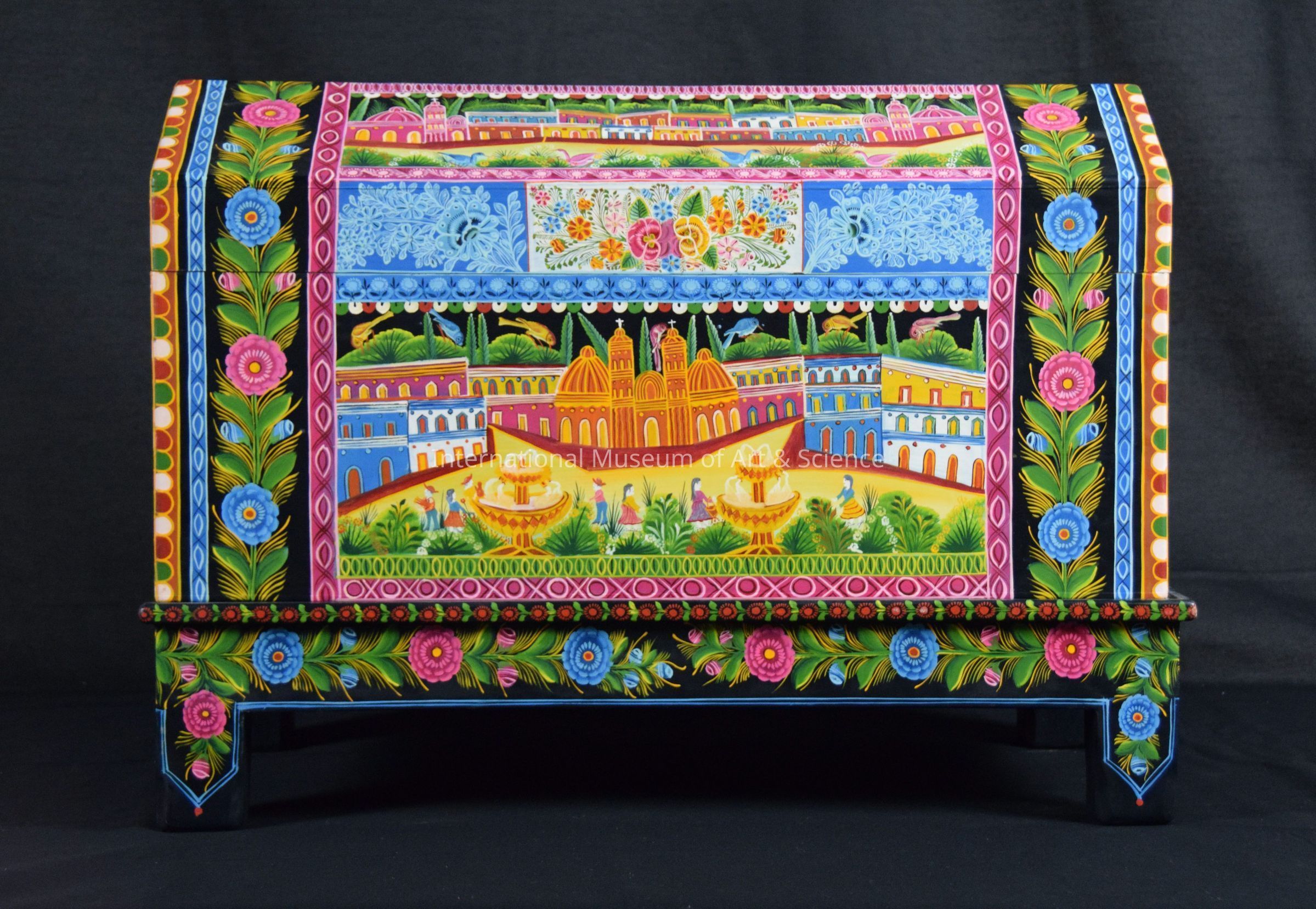 Rectangular, with "barn roof" lid, hinged; sitting on separate base. Chest: Black background with decorative, floral, and jungle design painted in various shades and tints of red, blue, yellow, green, orange, pink, brown, and white. Back is solid black. Base: Same color palette. Back is solid black. 4 legs. Interior of chest and unexposed parts of base are bare wood. Wood has strong citrus-like odor.Artwork Details