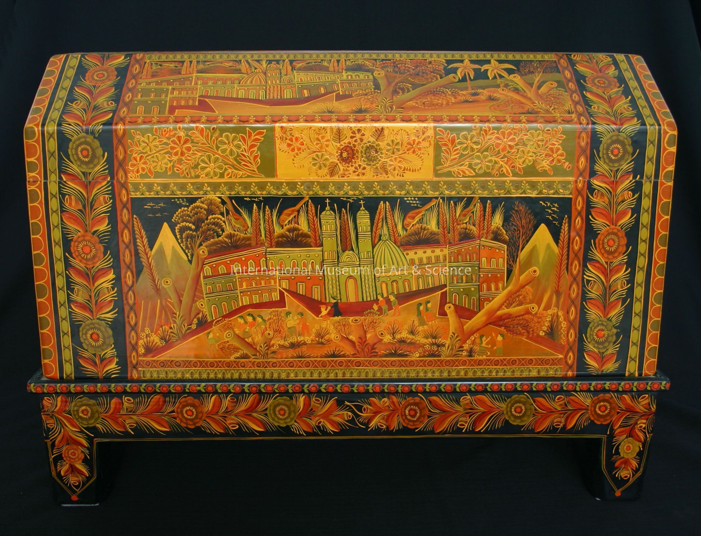 Rectangular, with "barn roof" lid, hinged; sitting on separate base. Chest: Black background with decorative, floral, and landscape design painted in various shades and tints of orange, brown, and muted greens. Back is solid black. Base: Same color palette. Back is solid black, 4 legs. Interior of chest and unexposed parts of base are bare wood. Wood has strong citrus-like odor.Artwork Details