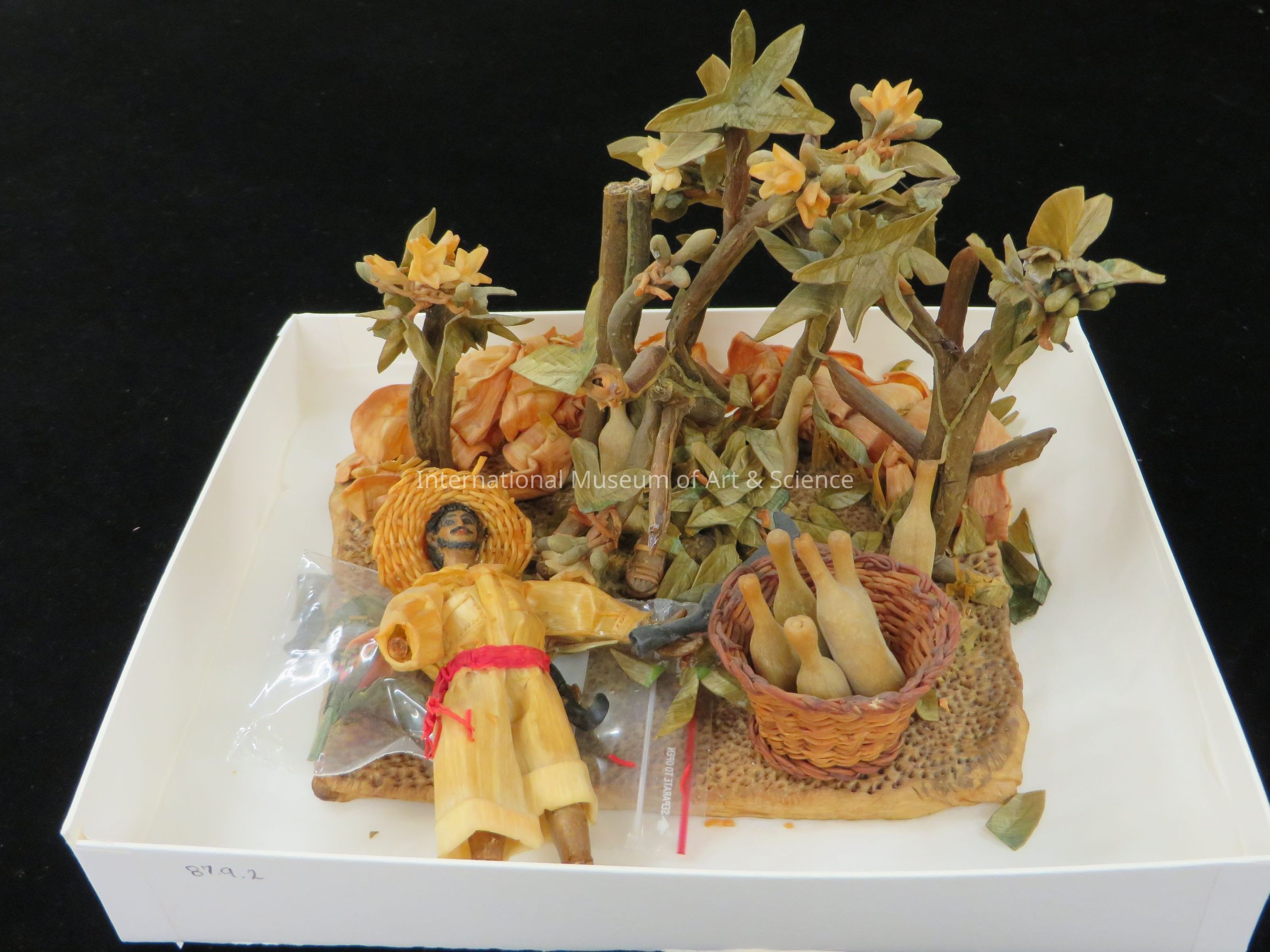 "Chicle figure scene". Scene depicts mand with machete cutting flowering trees; man is wearing white shirt and pants iwth a red sash, beige woven hat, brown sandals; holding machete in one hand and a hooked tool in the other; standing by flowering trees with green fruits and leaves; orange dry leaves on hte ground; woven basket with collection of bottles inside. Square base.Dimensions