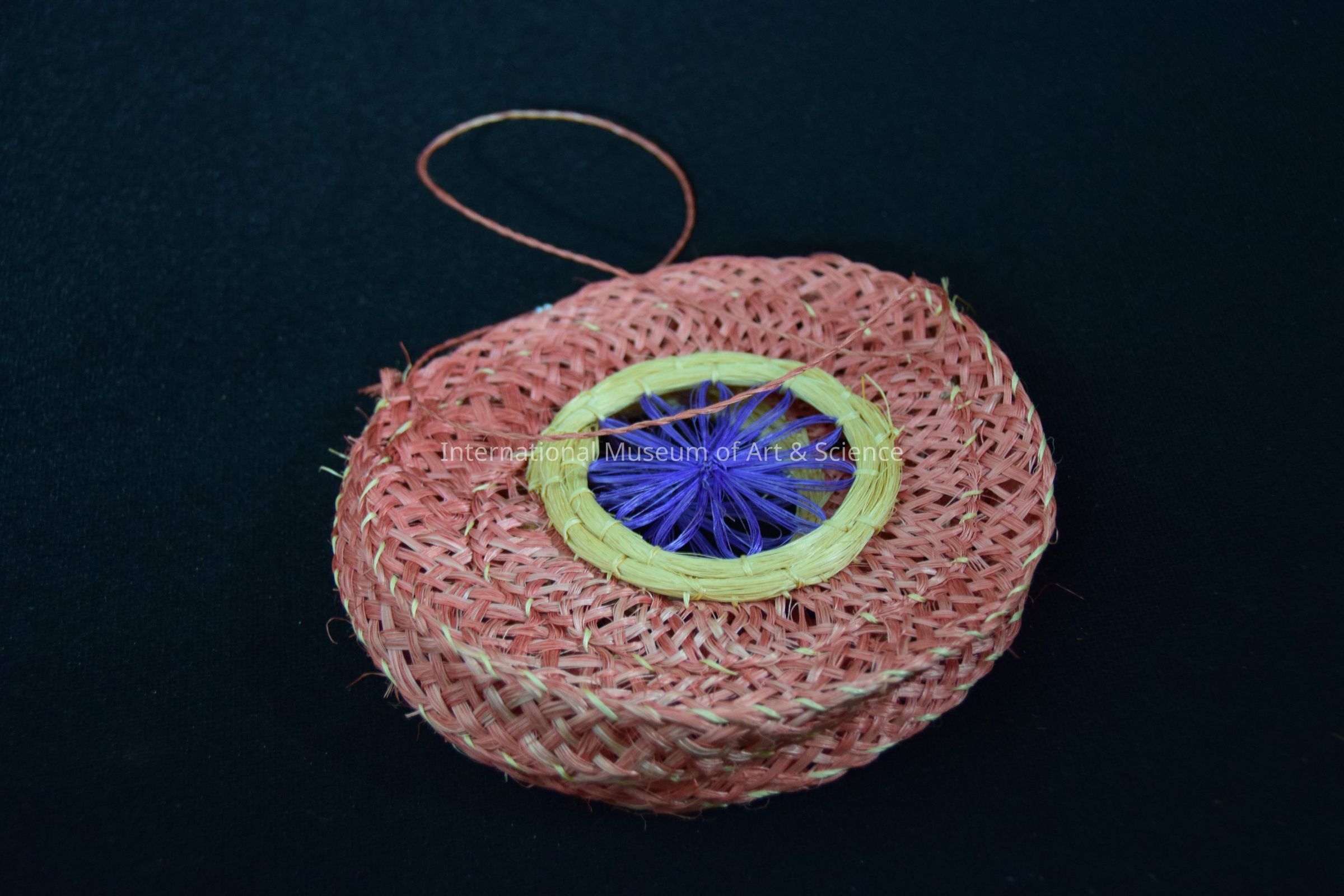 Child's Bag. Circular small bag constructed of red braided "discs" of henequen. The center of the bag consists of a purple dyed henequen "flower" pattern, circled by thick bunches of antural henequen strands. The "discs" of which the purse is constructed appear to have been laced or sewn together with strands of antural henquen. The handle is thin and consists of twisted, red dyed, henequen fibers. Hilda Maria Ya Medina (Maya) also Hilda Veronica Canche Luna (daughter-in-law)