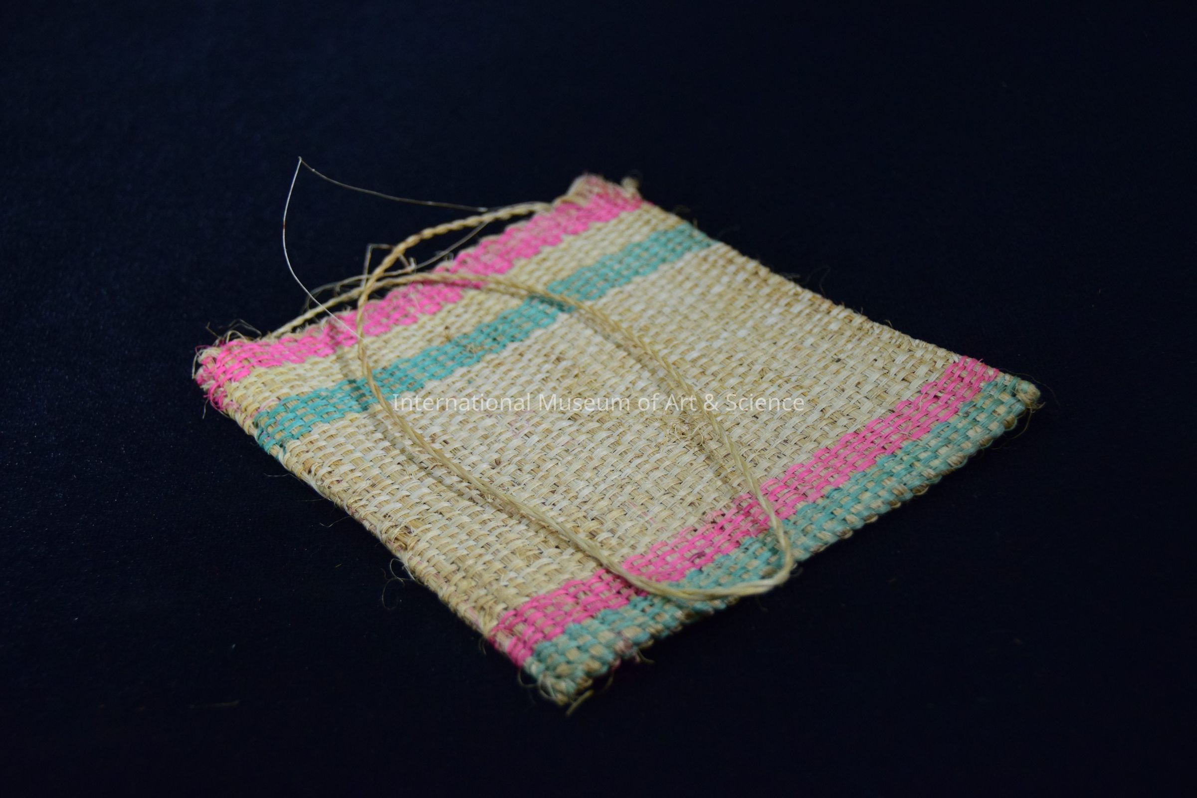 Child's purse woven with natural and dyed henequen fibers; small purse with flat square body decorated wit pick, yellow, amd green bands at the top and bottom; middle section of purse is natural cream color; long, thin handle twisted of natural henequen fibers.Artwork Details