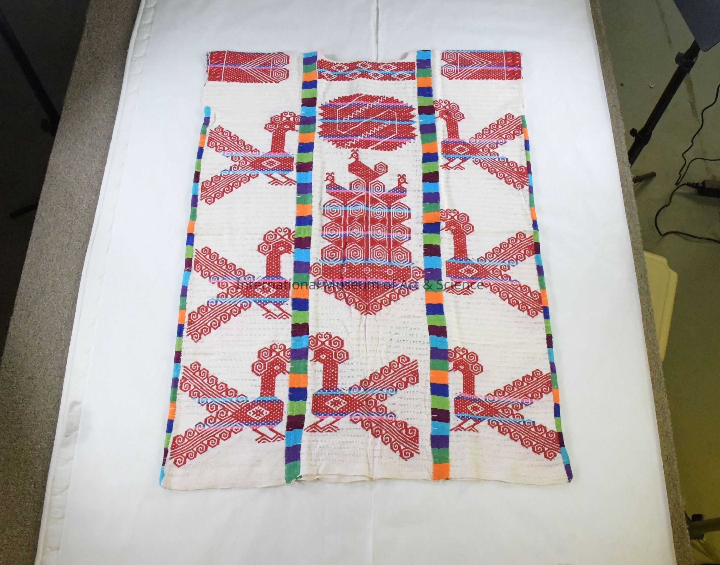This Chinantec huipil is constructed of handwoven cotton in a plain weave gauze structure with three-lienzo, produced on a backstrap loom. The ground fabric is a natural white with openwork textures characteristic of daily-wear huipils from the region. The garment features complex counted-thread embroidery using red, blue, purple, orange, and green threads. The central motif includes quetzal-like birds and stacked geometric forms, embroidered in dense red threadwork accented by vibrant multicolor pattern bands. Vertical seams are joined with an elaborately worked “randa” — a decorative joining band — executed in a counted-stitch technique. Brightly colored satin "listones" (ribbons) were likely once affixed to the neckline and side seams, a practice common to fiesta garments. These have since been removed or were never attached. The neckline has a modest square cut with signs of finishing having worn or been altered.Ethnography