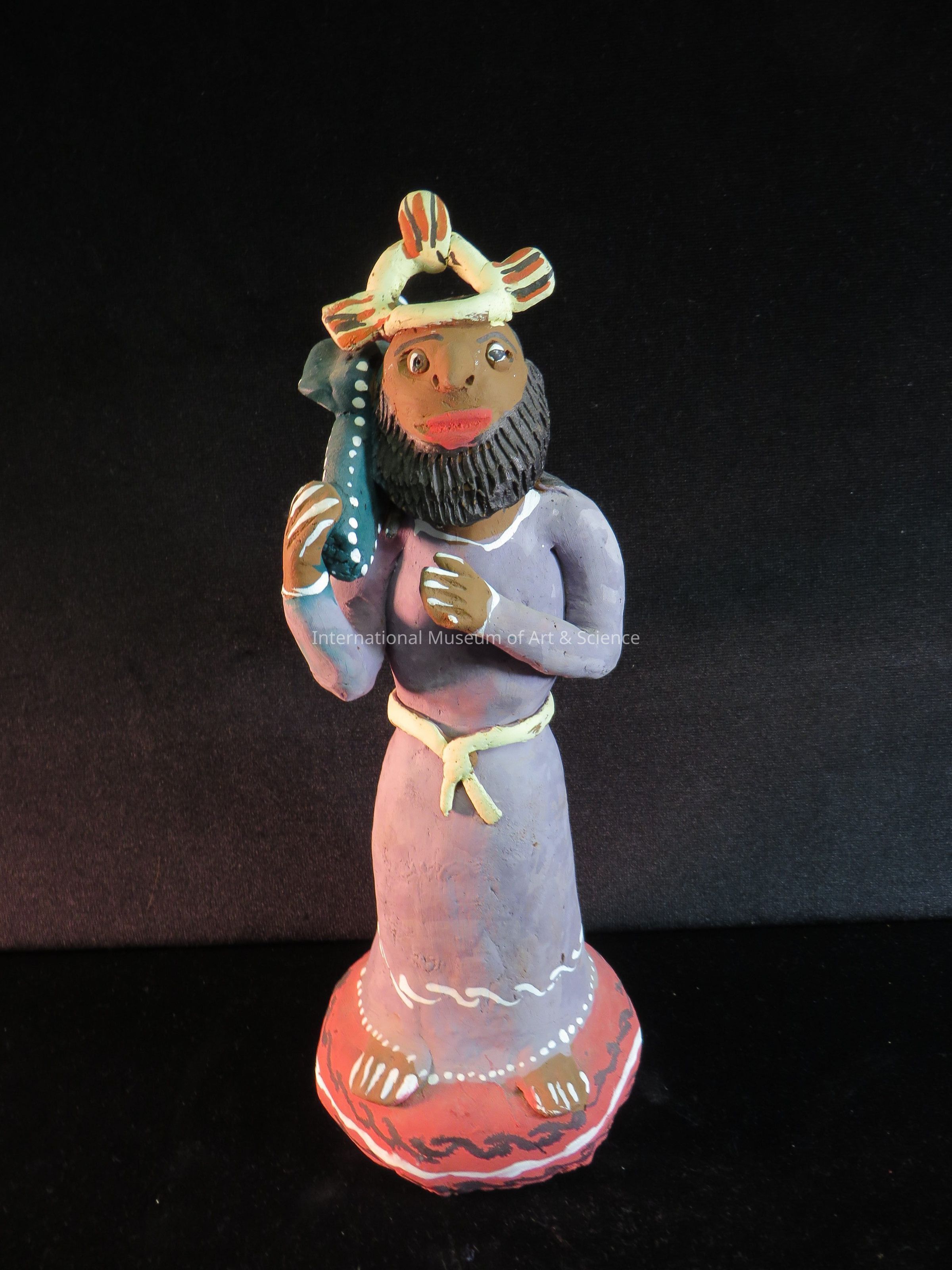 Christ carrying cross. Christ figure with dark brown flesh color; yellow crown and belt; purple robe; carrying green cross; black beard; red round base.Dimensions