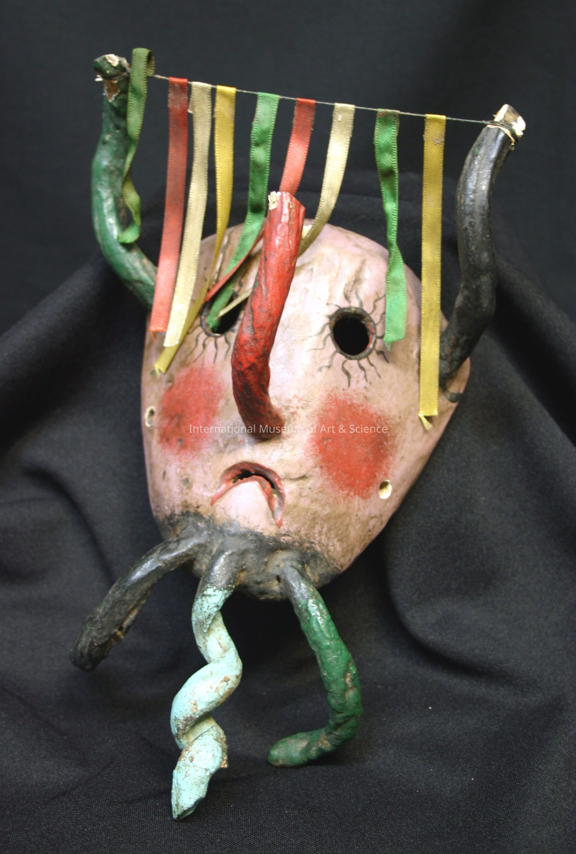 Mask; two horns with wire between and red, yellow and green ribbons hung on wire; downward mouth; red nose twirled upward; three horns on chin, center one twisted; pink face, red cheeks.Artwork Details