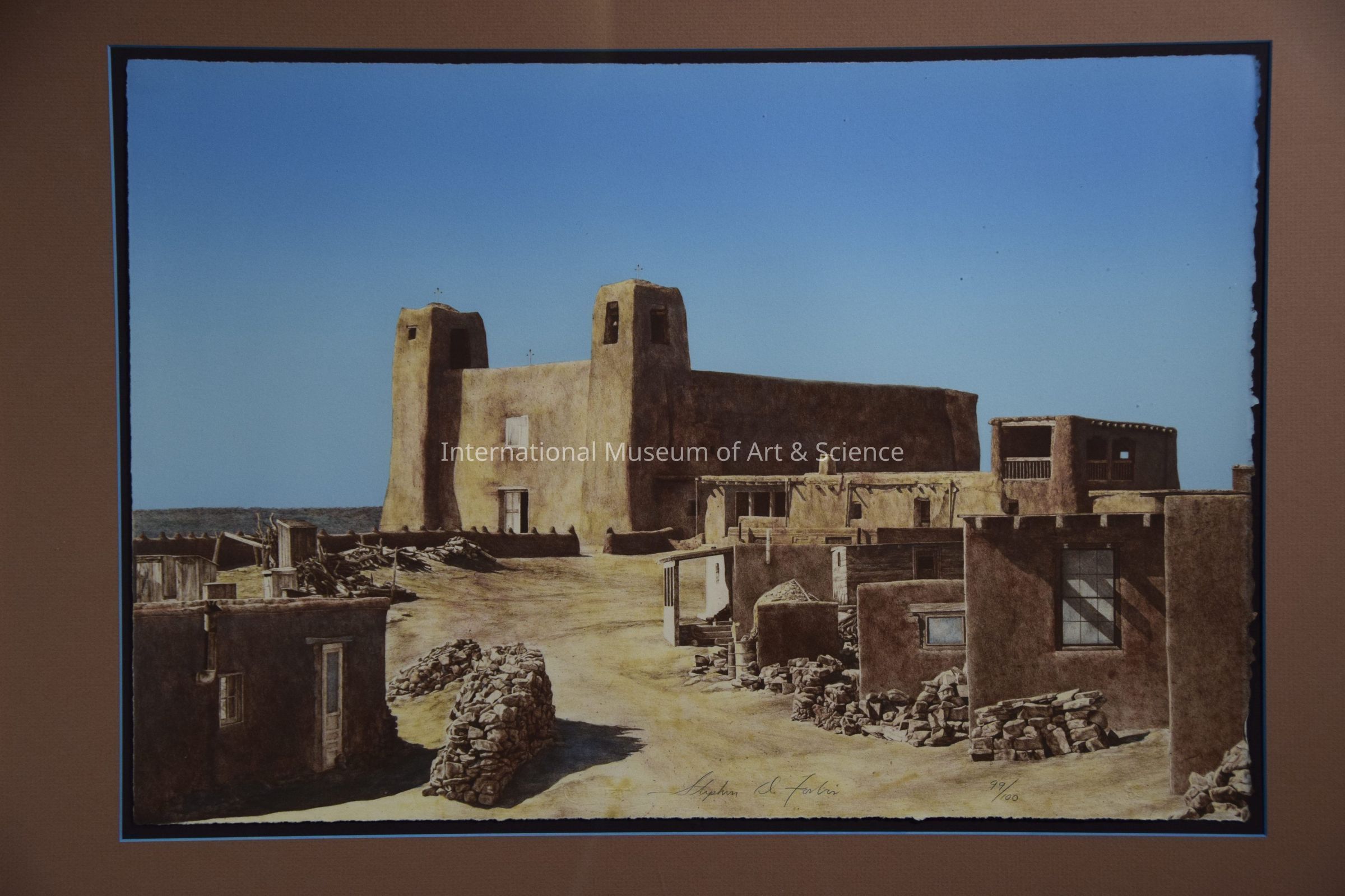 Lithograph. "Church At Acoma," by Stephen D. Forbis. Seven-color print. Printing executed in Austin, Texas. Depicts natural colored pueblo against medium blue sky. Completed 7/81. 99/100 edition.Dimensions