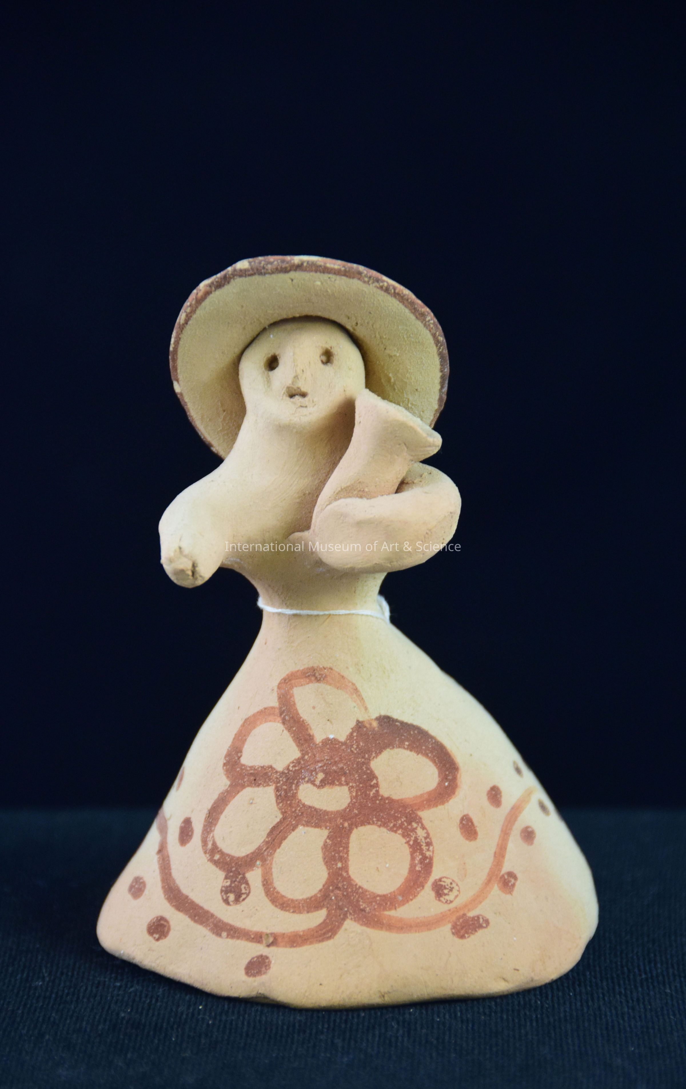 Clay bell figure with painted design on skirt. The figure has a large hat and is holding a vase/pot.