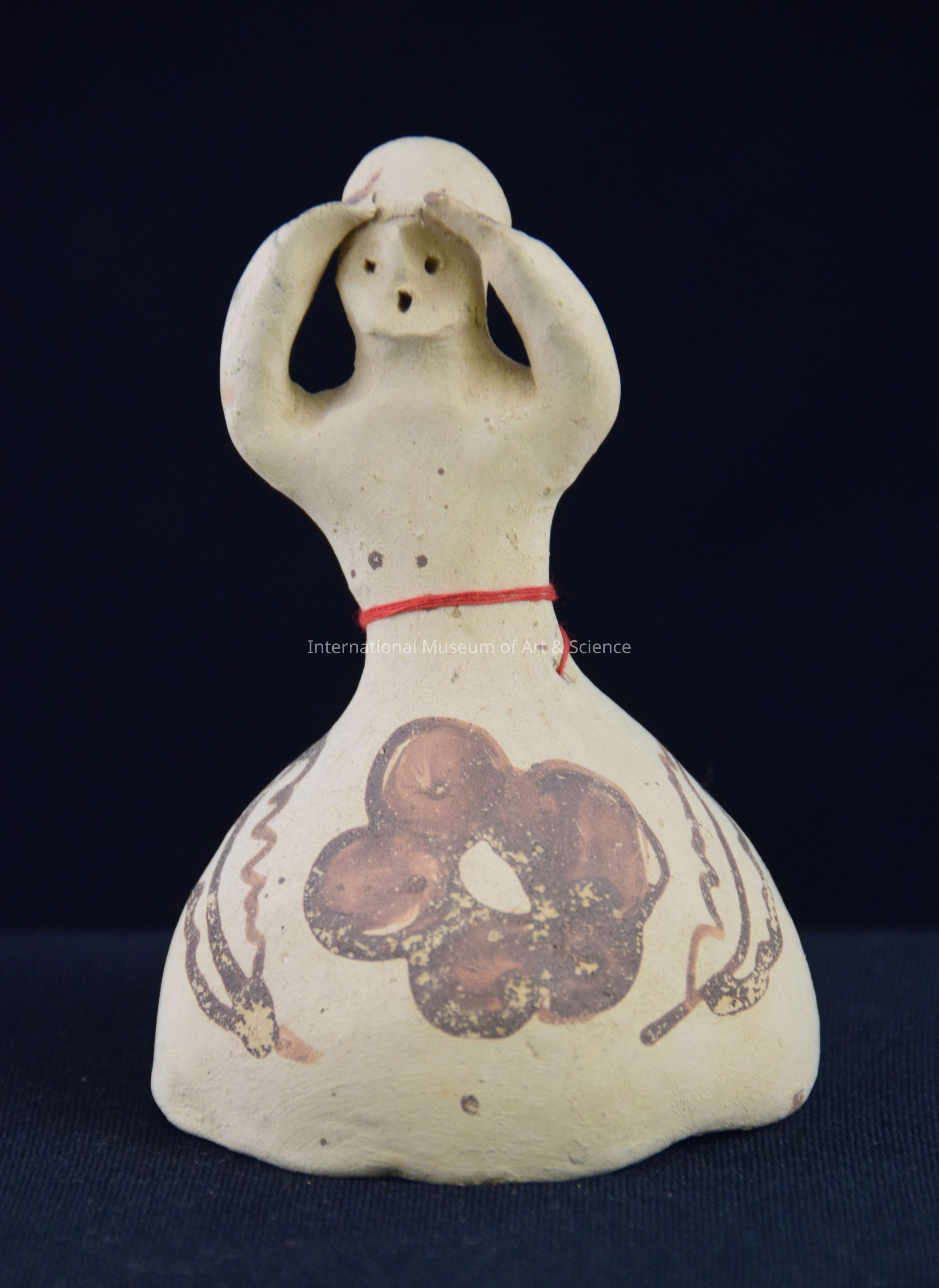 Clay bell figure with painted design on skirt. The figure's hands are raised towards the head.