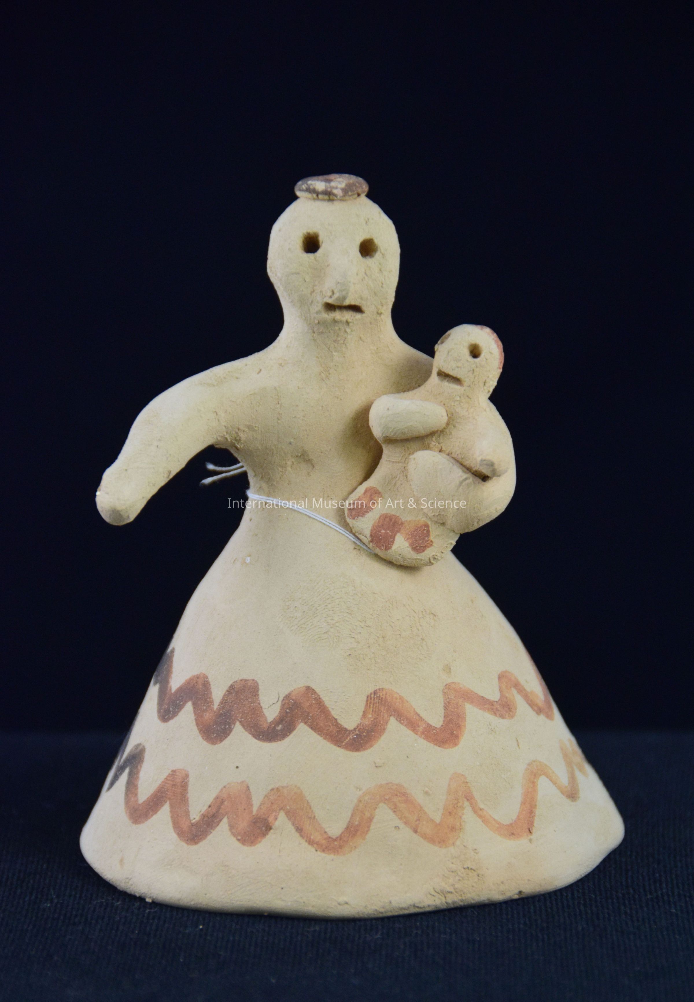 Clay bell figure with design painted on skirt. The figure is holding a baby.