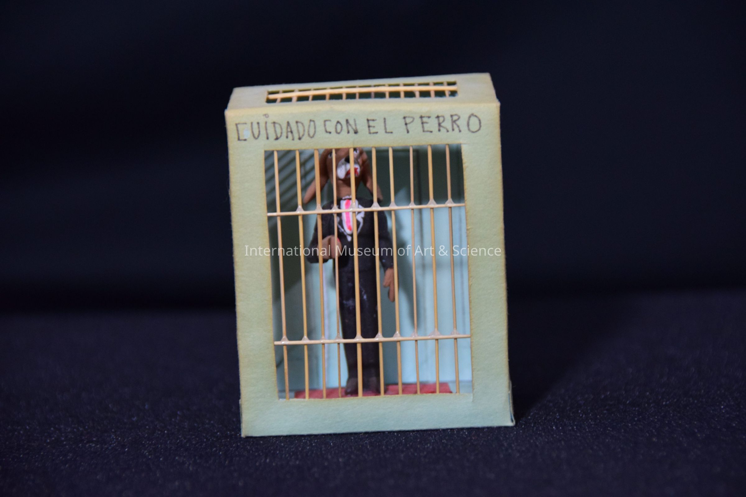 "Cuidado con El Perro." (Beware of the Dog). Clay dog figure inside blue paper; cage bars made of bamboo sticks; dos represents the president of Mexico; dog is painted dark brown and has long ears, wears a black suit and stands on a red square wooden base.Artwork Details