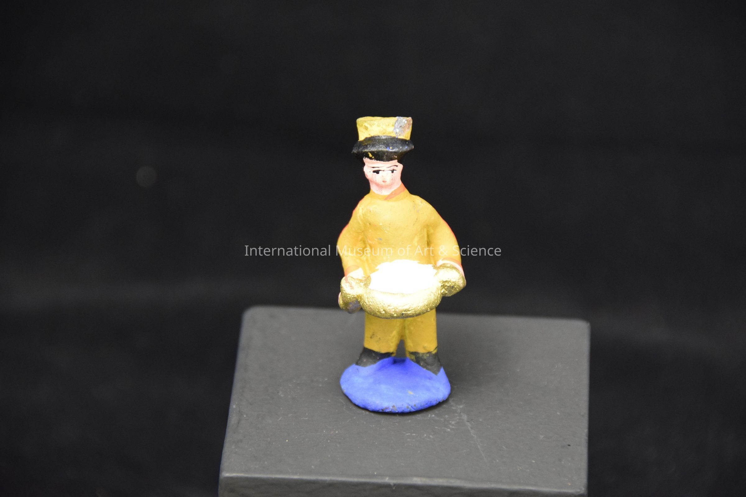 Clay musician. Playing white and gold drum wearing yellow orange uniform; standing on blue base.