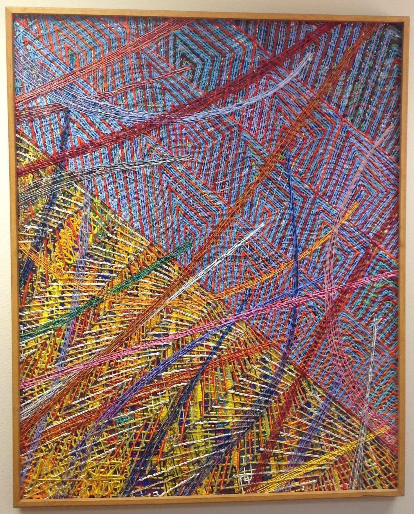 "Computer Chips and Transistor Minds". Acrylic on canvas, wood. Early 1985. Abstract painting layers of multi-colored acrylic paints applied out of the tube onto canvas.Artwork Details