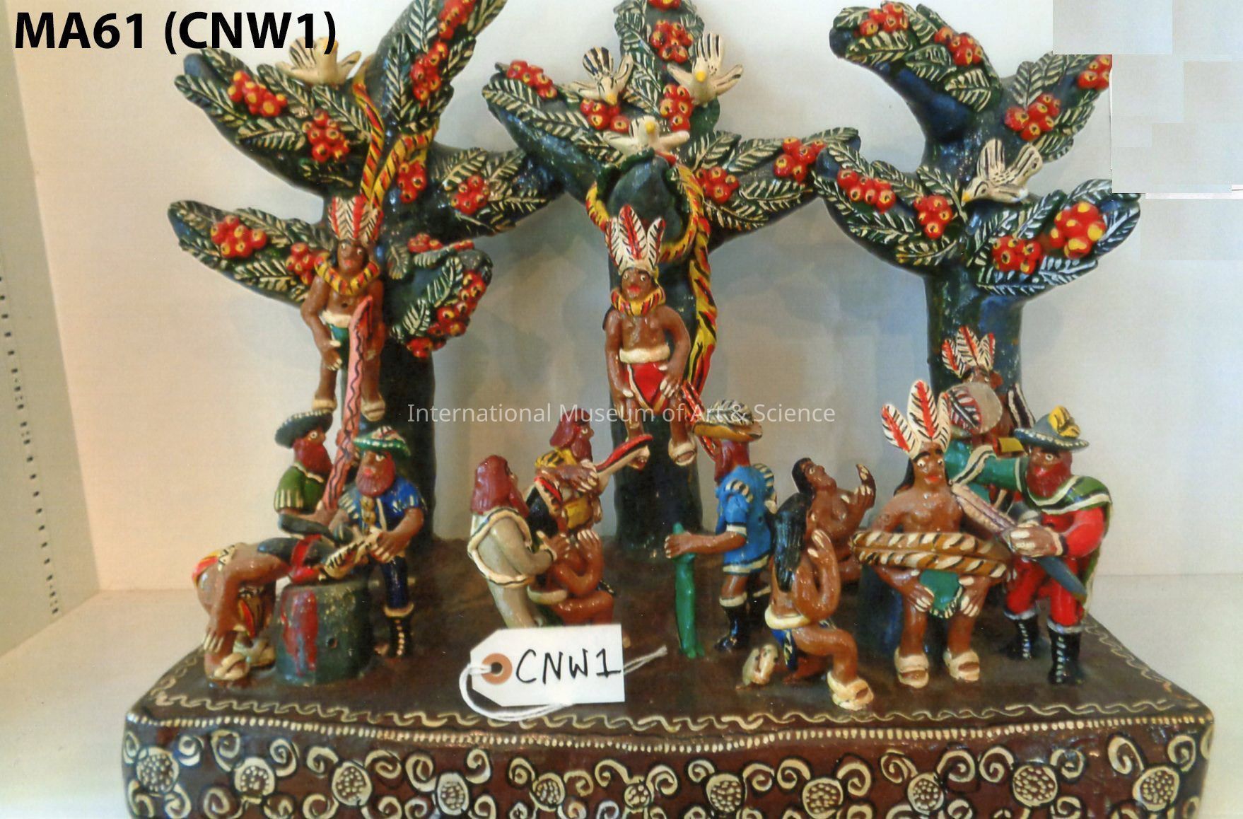 A ceramic scene of conquistadores torturing Mexican indigenous people. The scene has 15 people, 7 conquistadores and 8 indigenous people. There are three trees at the back of the scene. There are 2 indigenous people hang from them. The scene of figures stand on a large base.Ethnography