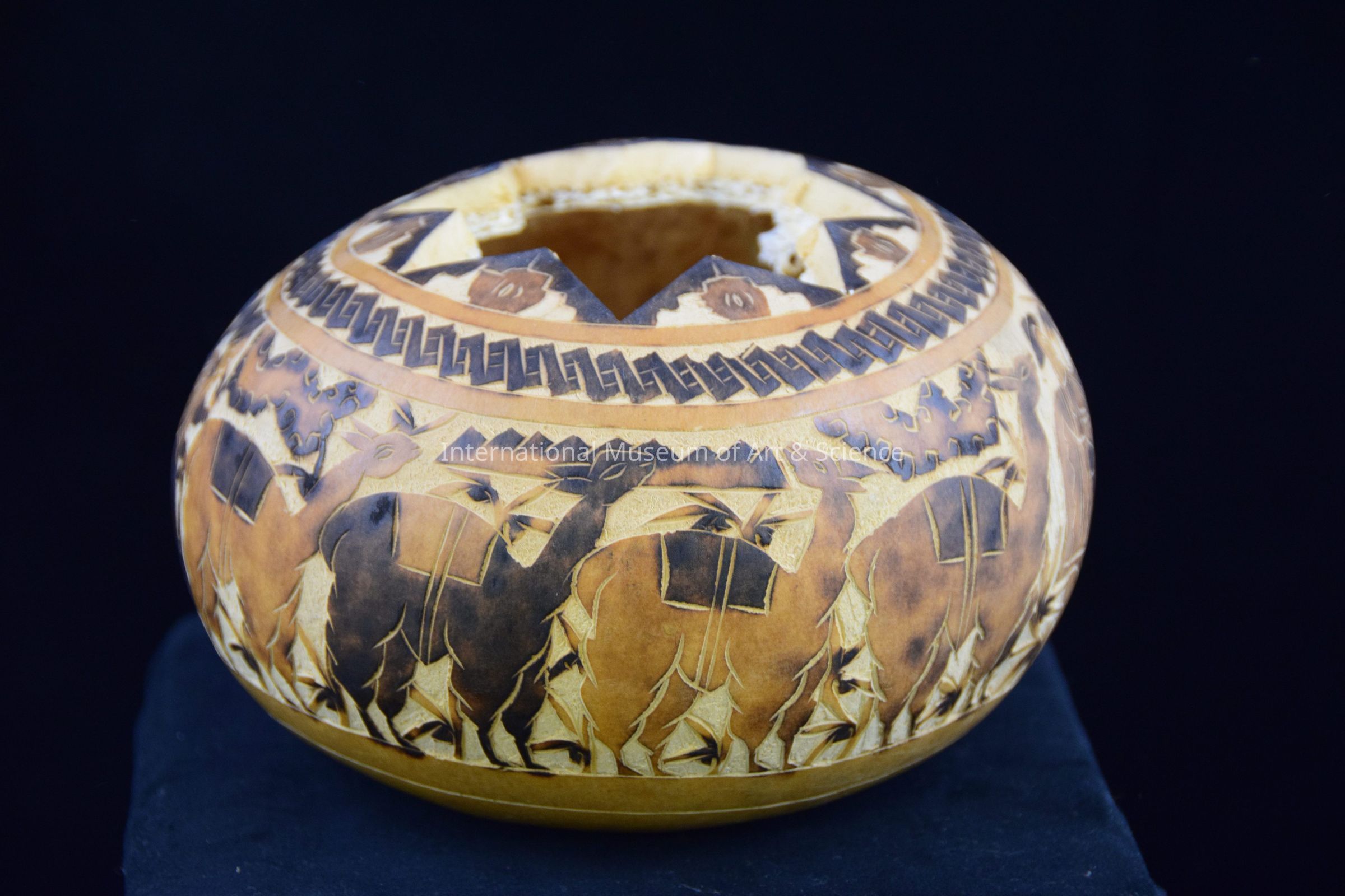 A storage container carved from a gourd. The exterior of the gourd is carved with a scene of llamas and people, there are also geometric designs near the lid of the container. Areas of the designs have been detailed with a drk brown stain.Dimensions