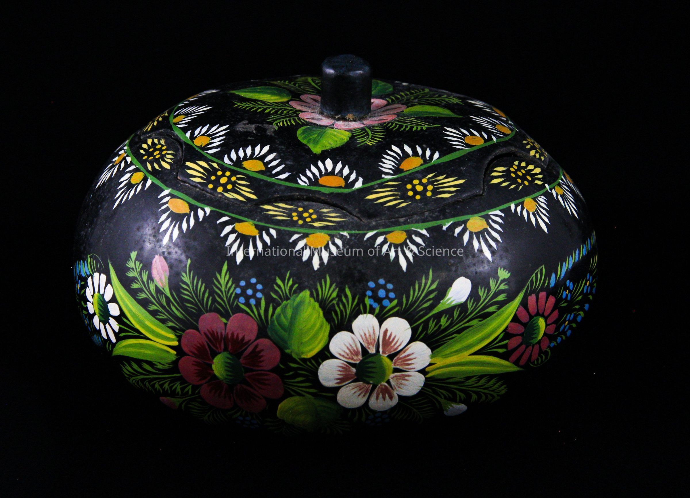 A container or trinket box carved from a gourd. The gourd has been painted black and then decorated with floral designs. The container has been lacquered to give it a shiny finish.Made/Created