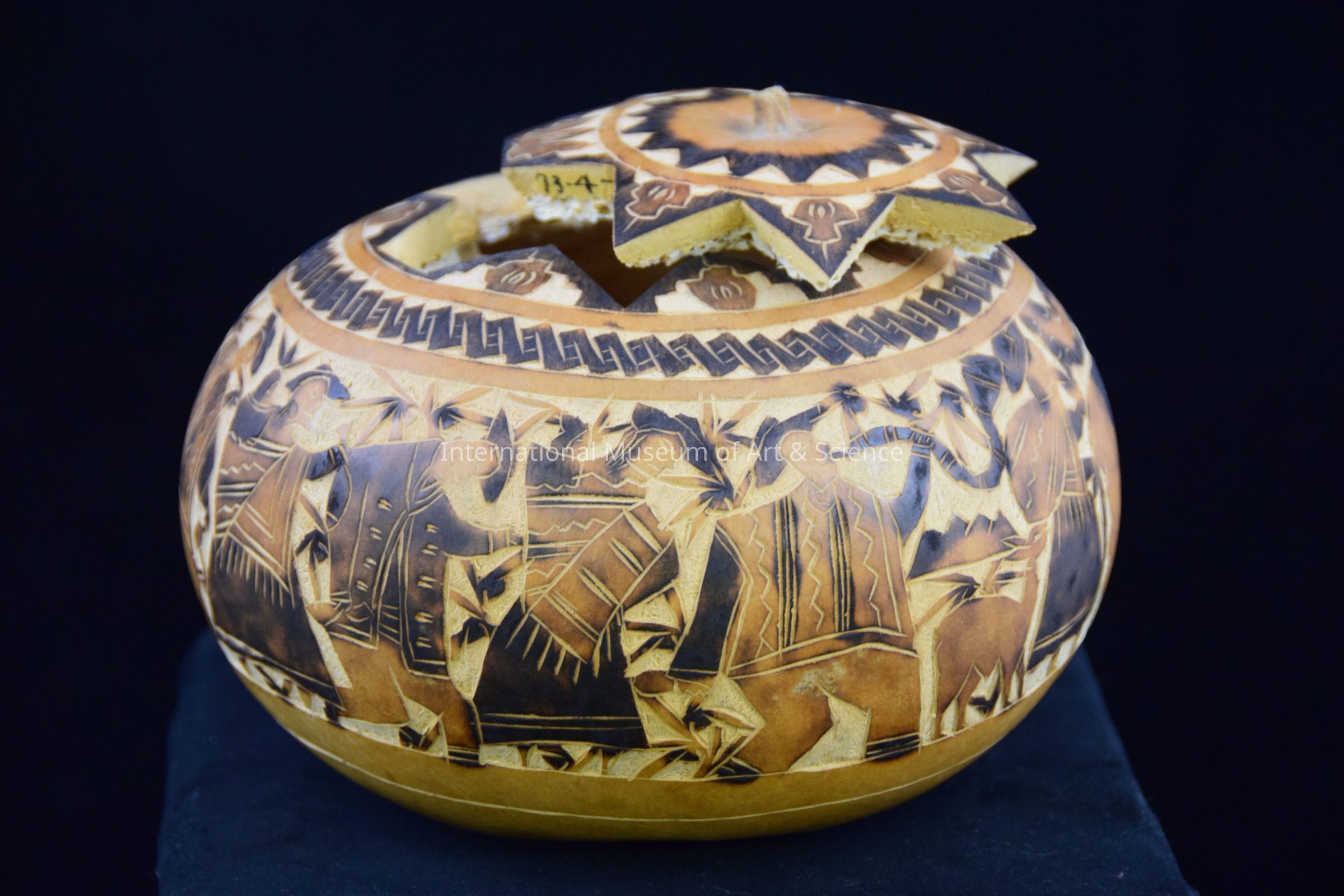 A storage container carved from a gourd. The exterior of the gourd is carved with a scene of llamas and people, there are also geometric designs near the lid of the container. Areas of the designs have been detailed with a drk brown stain.Dimensions