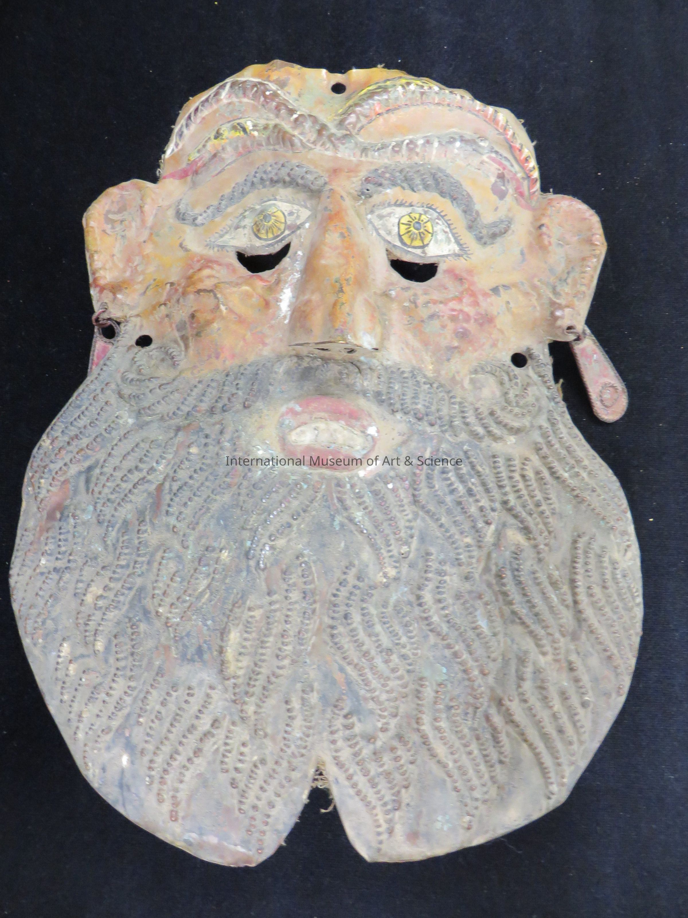 Face panel. Face panel representing the Bearded Man; yellow eyes, two flat copper red earrings on his lobes; two small repousse snakes on the forehead. Heavy black eyebrows, red face and thin mouth with tiny teeth, large red ears decorated with two flat copper red earings on his lobes; flat top, no hair; rounded black repousse beard with a bituracte cut in the bottom, and a sharp prominent nose soldered to the surface; two small multi-colored repousse clubras, snackes on the forehead, small chin cup soldered on the back; interior lined with cloth.Made/Created