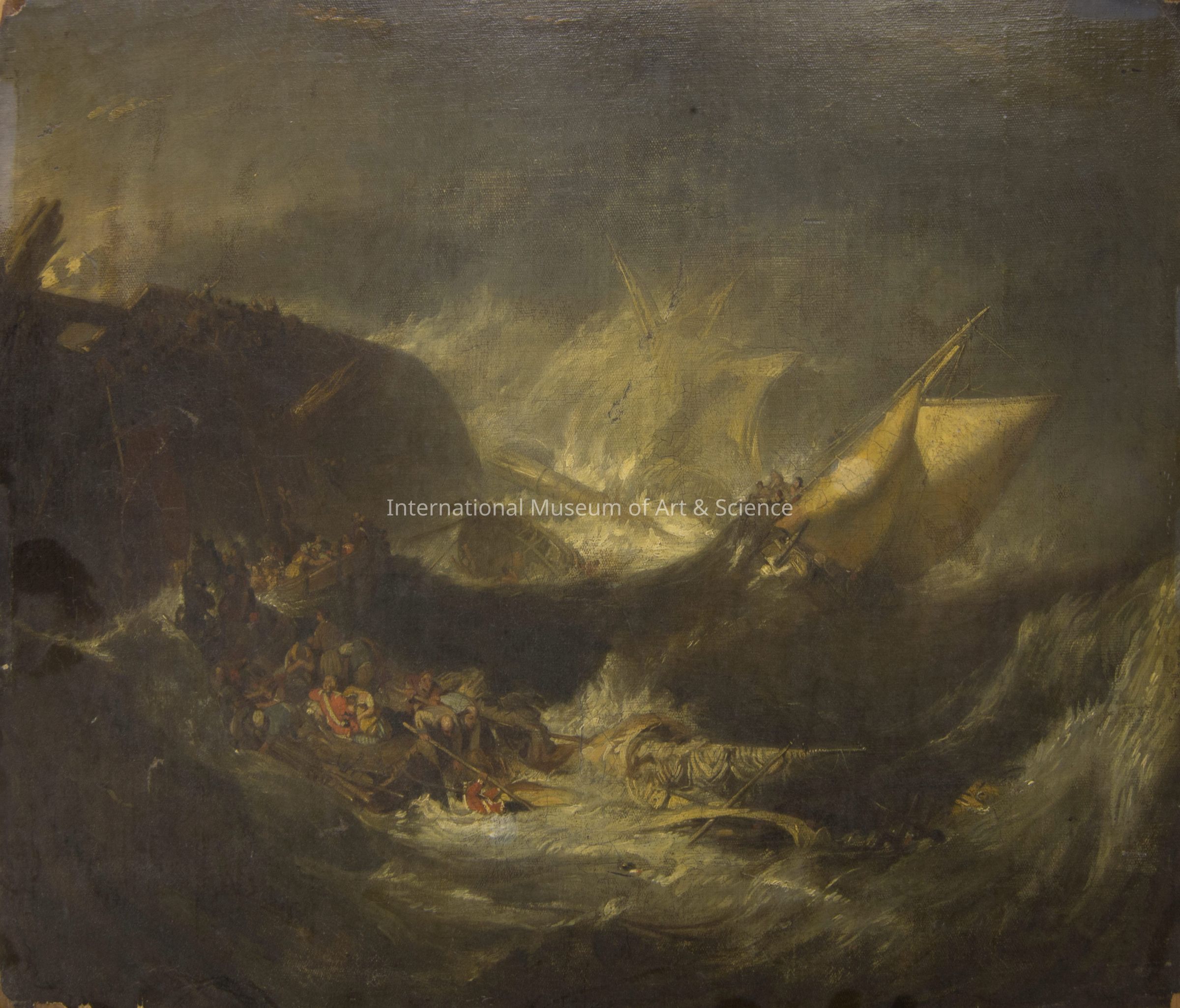 COPY of "The Wreck of Minotaur...on the Haak Sands". artist unknown. oil on canvas. 1810. Scene of a shipwreck with passengers scrambling for safety, crashing waves.