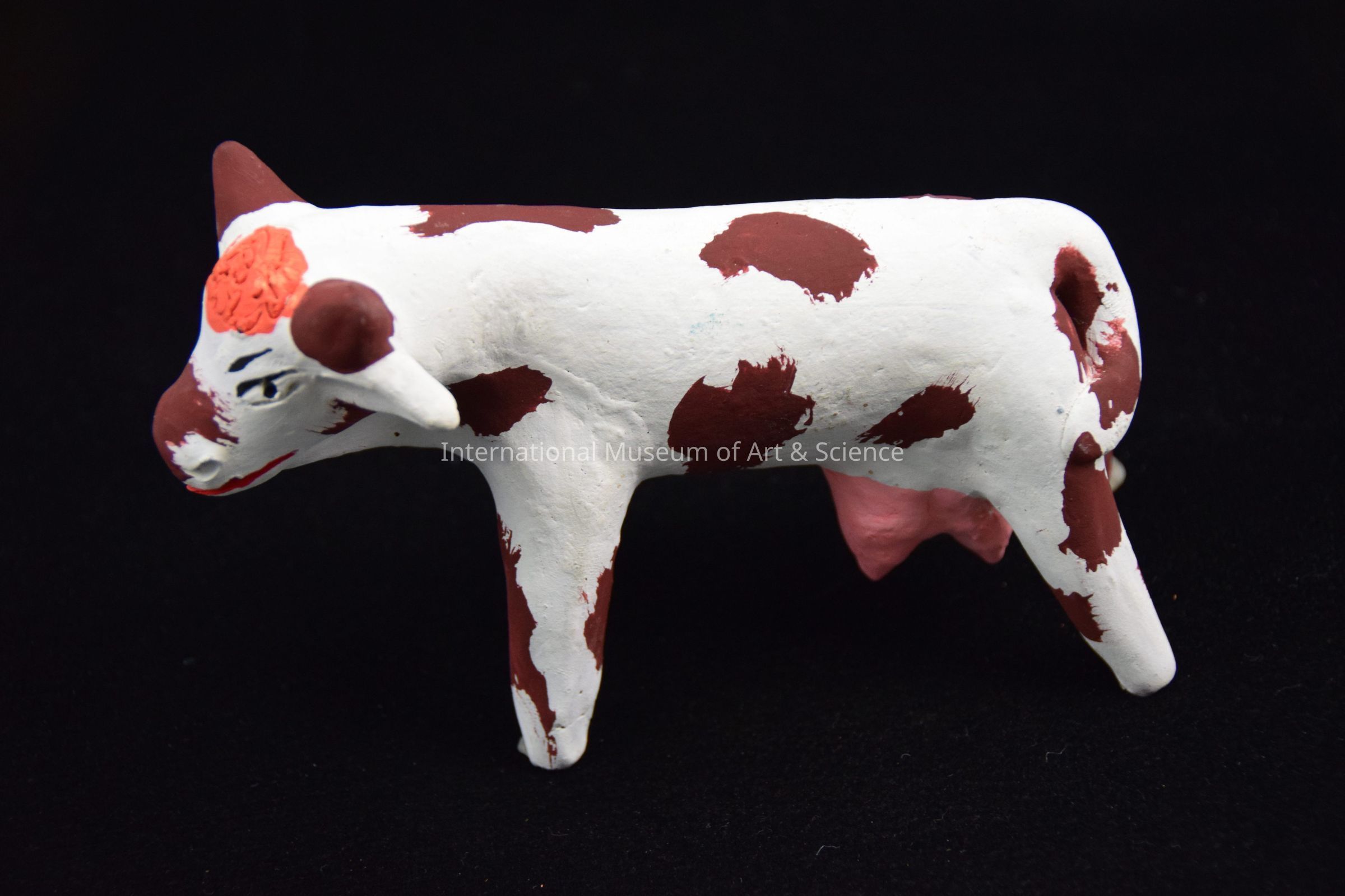 A ceramic figurine of a cow. The cow is white with brown spots and horns. Its udders are painted pink. It has a curly bit of orange hair on its head. Its eyes are black and its mouth is detailed in red.Dimensions