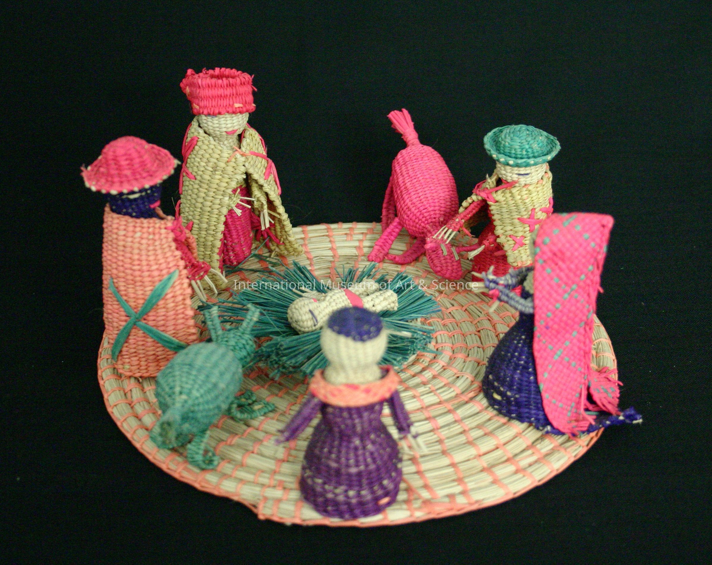 A Navitity scene. The piece is made from straw. Dyed straw is used to show clothing and details. There are six woven figures and two woven animals. Colors include pink, green, purple, blue, and red.Dimensions