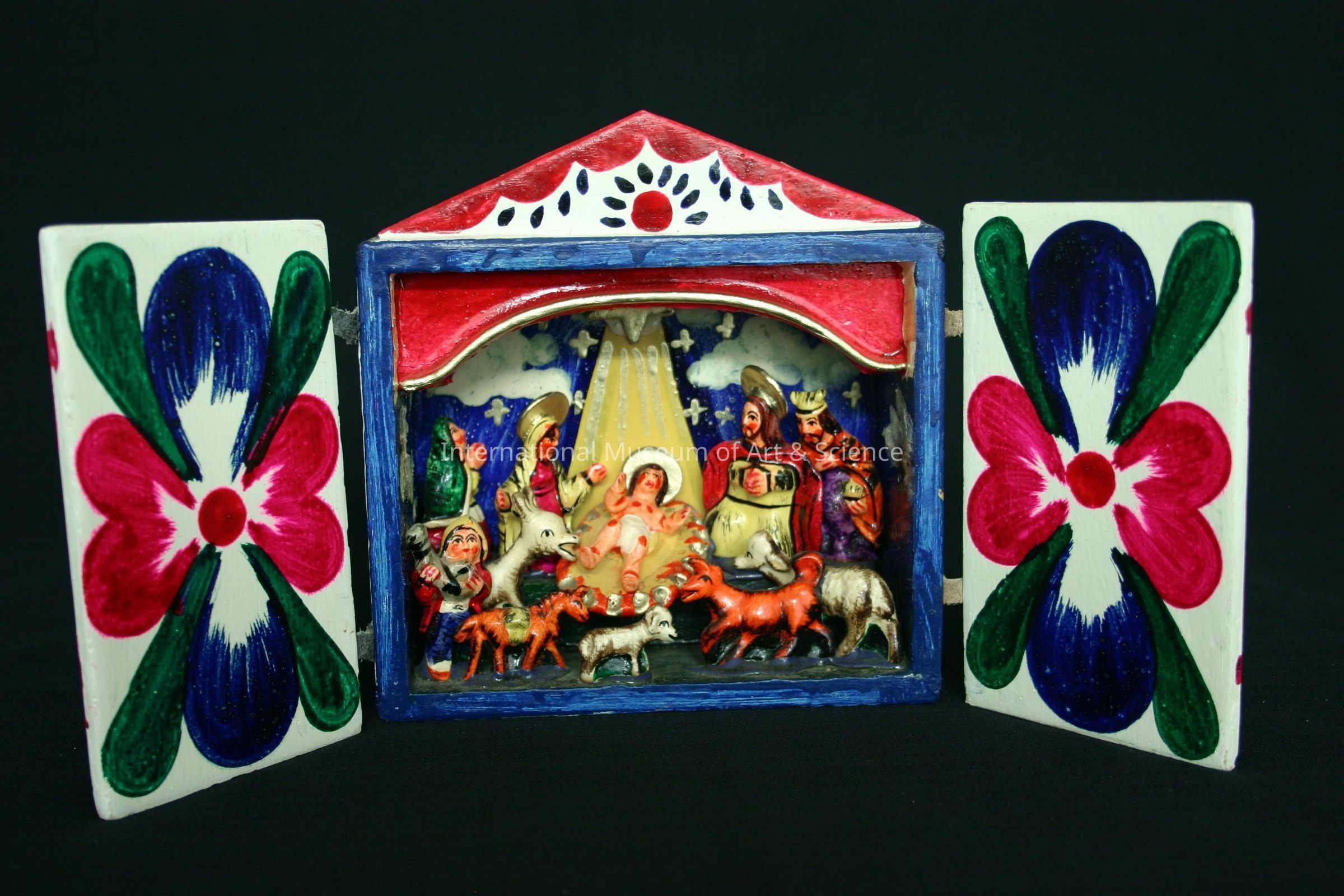 A nativity retablo. The white box has large rose flowers on doors, inside is the nativity scene. There is a dark blue sky, white clouds, a gold star over the Christ child, Joseph and Mary have gold halos. Surrounding them are the sheperd, wiseen, and animal figures.Artwork Details
