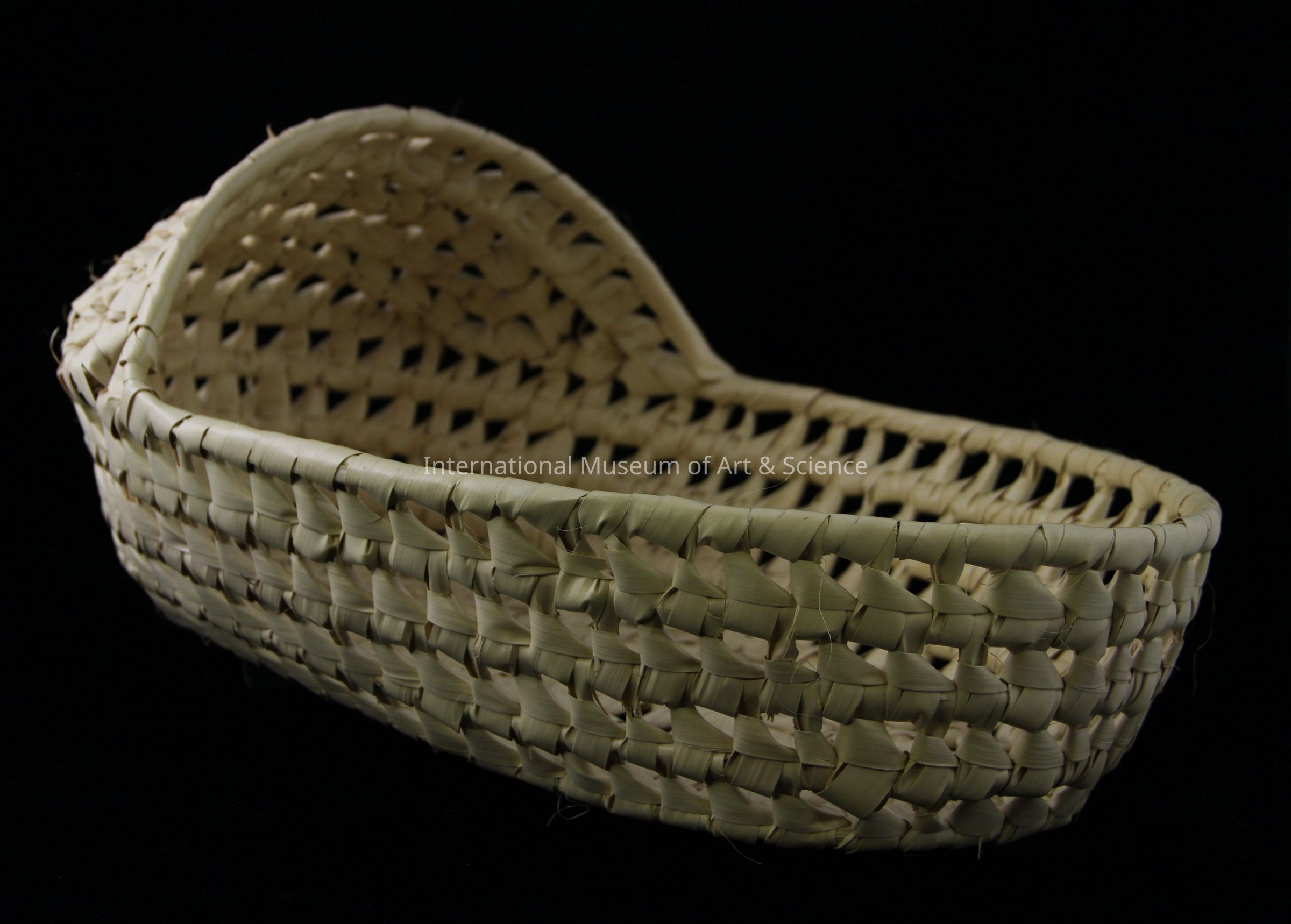 A baby basket. The basket is woven of 1/4" undyed guano stips warpped with 3/8 guano leaves. There is a woven hood extending over the basket for approximately 5 1/2" (14.0cm)Artwork Details
