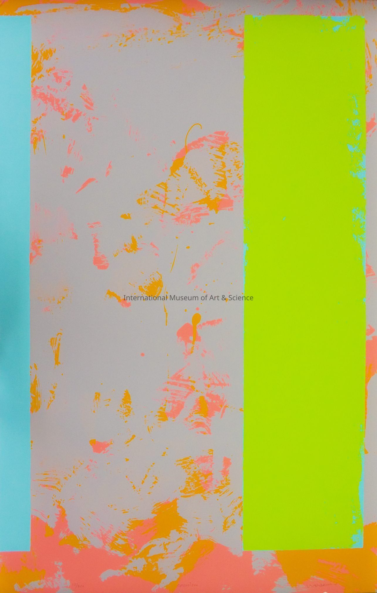 "Cronion." Central background of gray with bright pink and orange splotches in areas; left edge has vertical band of light blue; near right edge is band of yellow green with light blue touches on edges. Signed.Dimensions